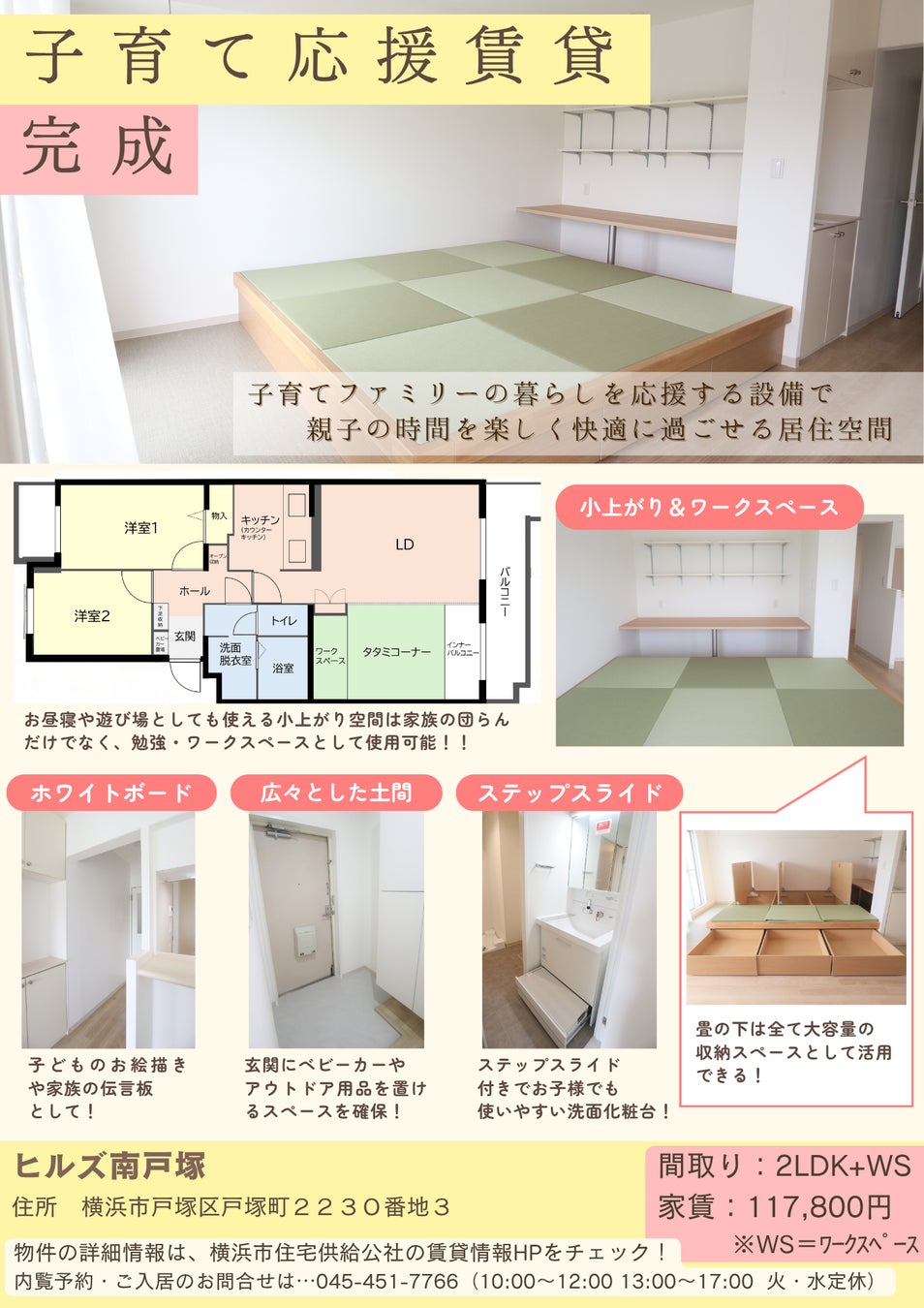 横浜市住宅供給公社(以下、公社)は、横浜市が目指す「子育てしたいまち(横浜市中期計画2022~2025掲載)」実現への貢献、公社が目指す「子育て・ファミリー世帯の需要に応える、子育て世帯の住生活向上に資する先駆的な取り組み(中期展望2024-2026)」の実現に向け、横浜市戸塚区にある公社賃貸住宅「ヒルズ南戸塚」の専有部においてリノベーション工事を実施し、このたび「子育て応援賃貸」が完成いたしました。