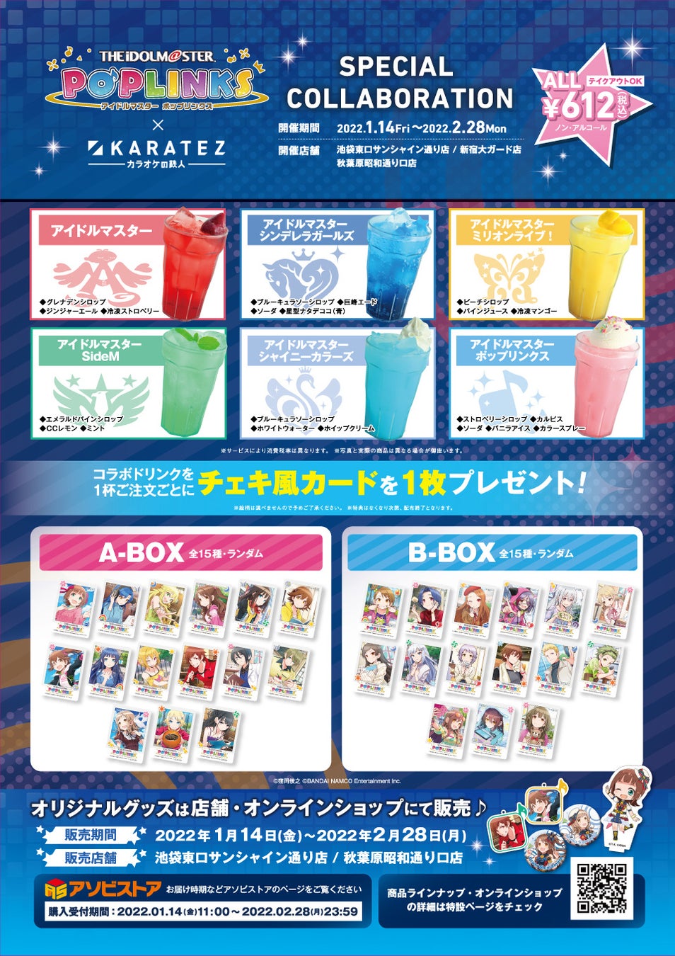 「アイドルマスター」シリーズを冠したオリジナルコラボドリンクを、各612円(税込)で販売します。ノベルティとして、コラボドリンク1杯の購入につき1枚のチェキ風カードを、2BOX・全30種の中からランダムでプレゼントします。