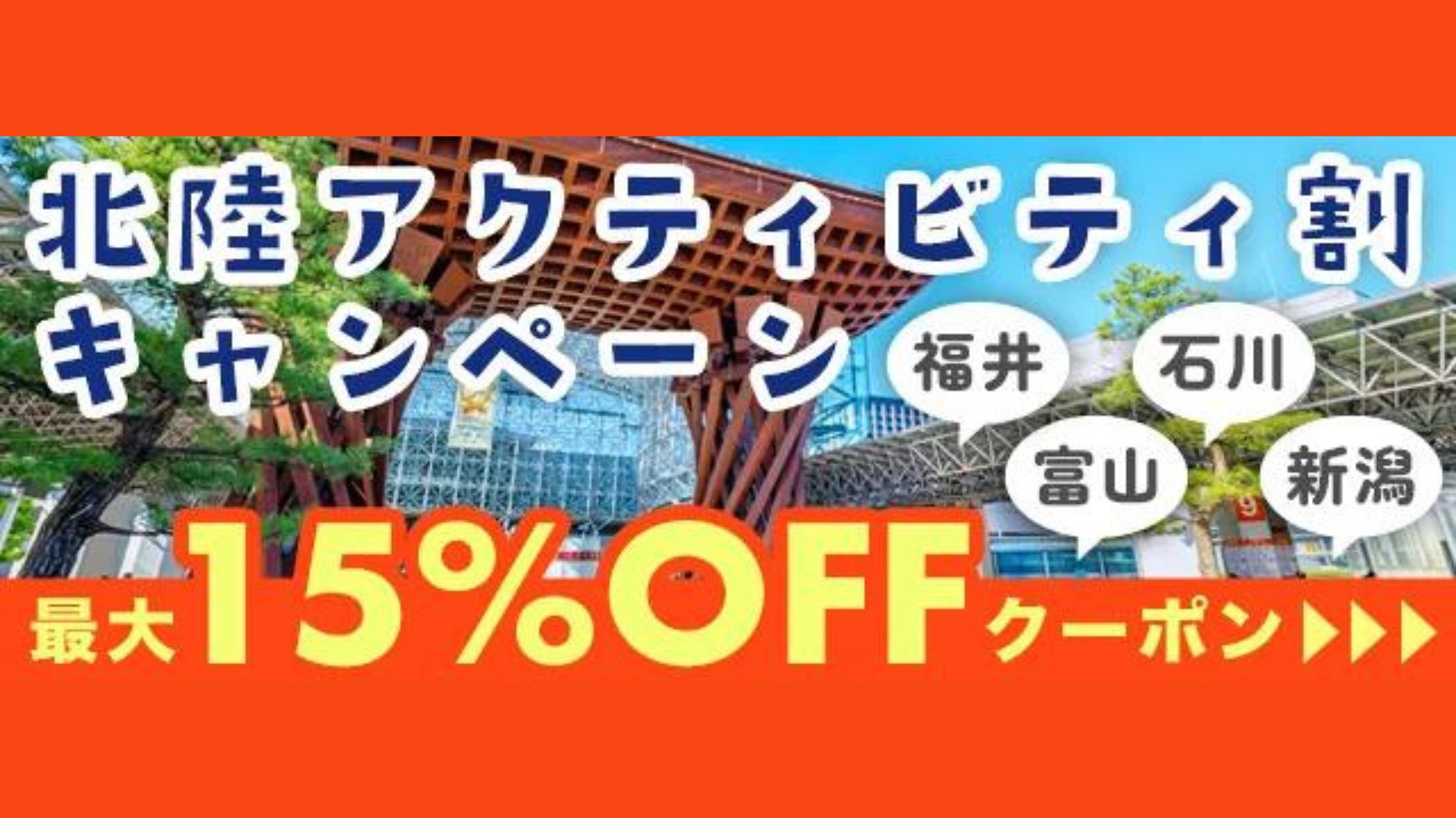 アクティビティジャパンに掲載されている石川県、富山県、福井県、新潟県の全てのアクティビティ商品を対象に、クーポンコードを入力すれば、期間中何回でも10,000円以上の利用で15%OFF(最大1,500円割引)になるキャンペーンを実施いたします。