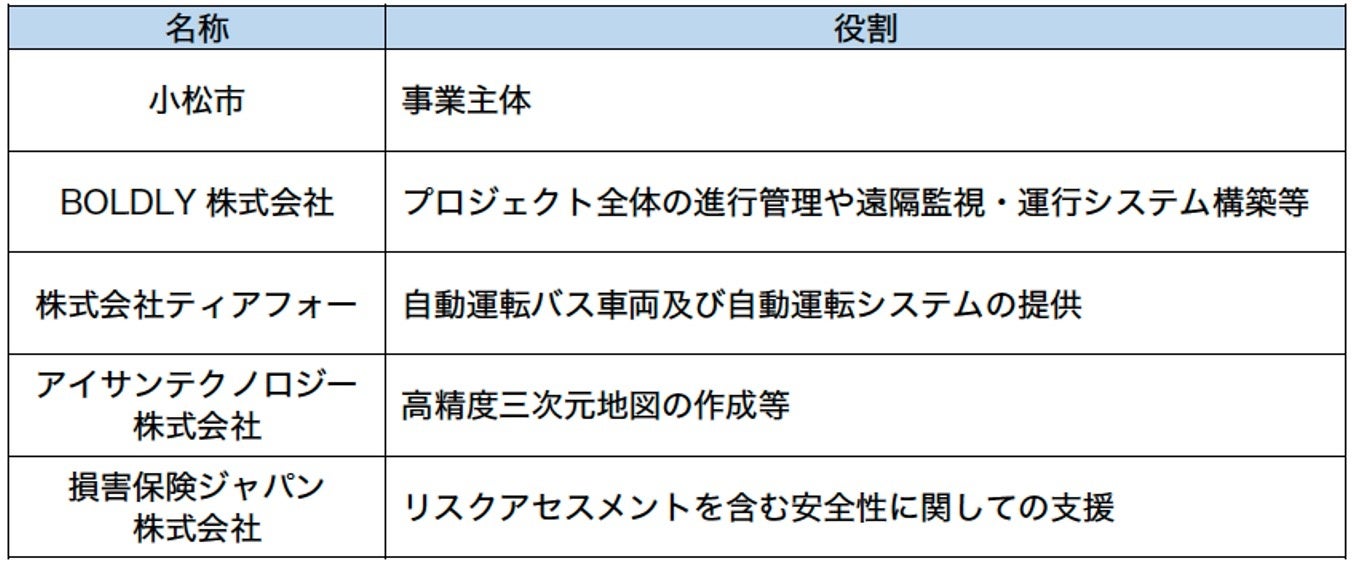 石川県小松市(市長:宮橋 勝栄)、BOLDLY株式会社(ボードリー、本社:東京都港区、代表取締役社長 兼 CEO:佐治 友基)、株式会社ティアフォー(本社:愛知県名古屋市、代表取締役社長:武田 一哉)、アイサンテクノロジー株式会社(本社:愛知県名古屋市、代表取締役社長:加藤 淳)及び損害保険ジャパン株式会社(本社:東京都新宿区、代表取締役社長:白川 儀一)の5者は、令和6年に予定される北陸新幹線小松駅開業に合わせ、JR小松駅・小松空港間のさらなるアクセス向上を図るため、自動運転バスの定常運行の社会実装を軸とした連携協定を、令和4年8月3日に締結しました。