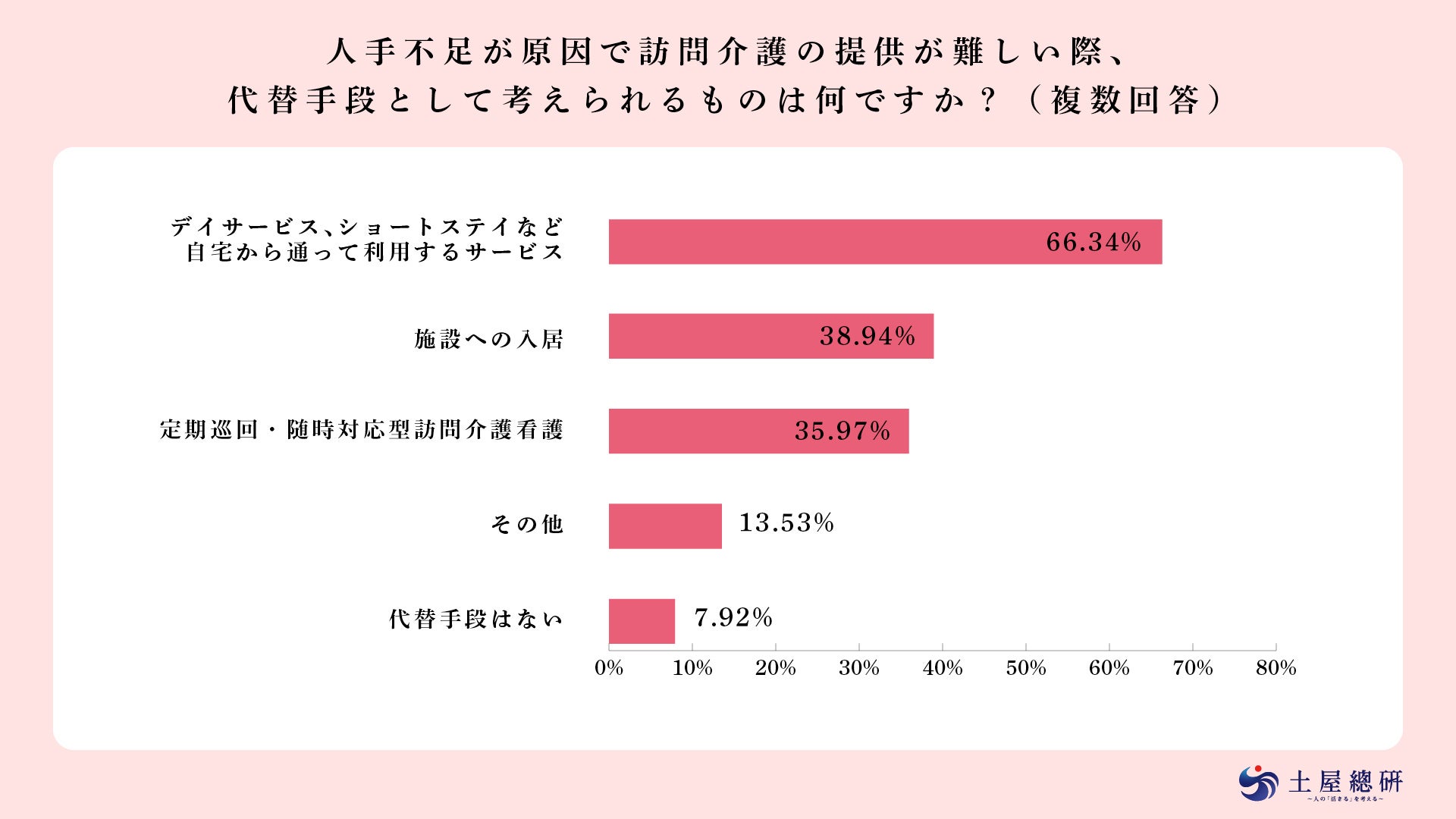 ケアマネが考える訪問介護の提供が難しい際の代替手段トップ3は「デイサービス、ショートステイなど自宅から通って利用するサービス」「施設への入居」「定期巡回・随時対応型訪問介護看護※」