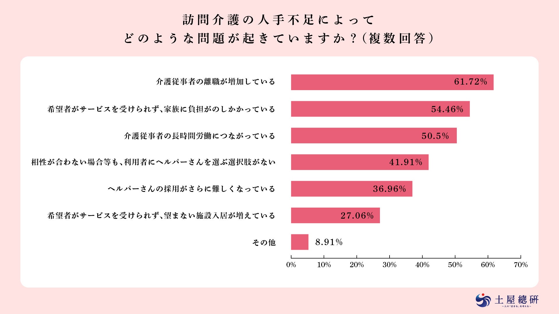 訪問介護人材の不足によって起きている問題トップ3は「介護従事者の離職が増加」「要介護者の家族の負担が増加」「介護従事者の長時間労働」