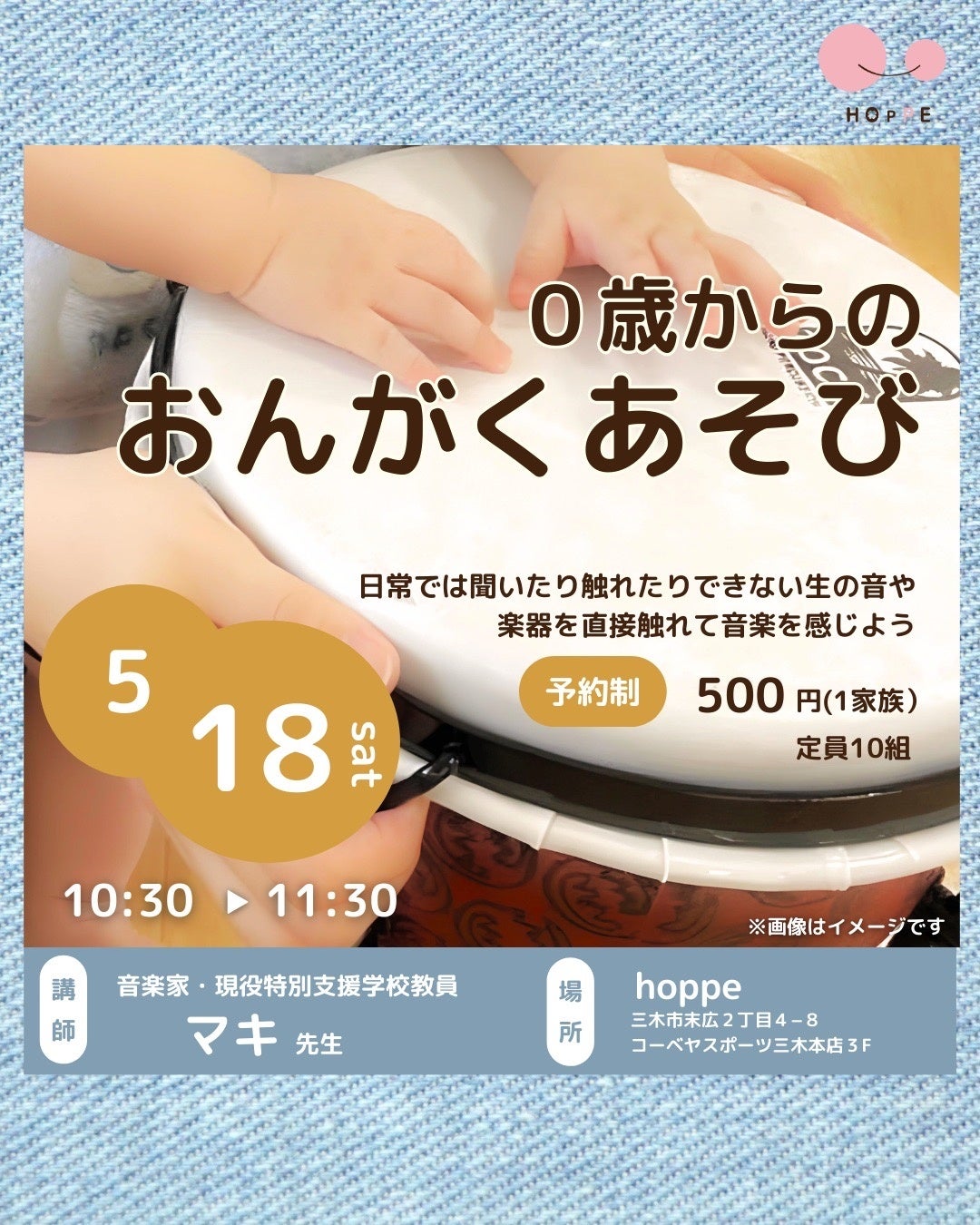 特定非営利活動法人ほっぺ(代表:大森 奈津子)は、音楽家・現役特別支援学校教員マキ先生をお招きし、2024年5月18日(土)hoppe(コーベヤスポーツ三木店3階)にて、『0歳からのおんがくあそび♪』を開催いたします。赤ちゃんから参加でき、パパと一緒の参加も多いイベントとなっています。この機会に、親子で生の音や楽器に直接触れ、音楽を感じてみませんか?先着制となっております。ご予約お待ちしております。
