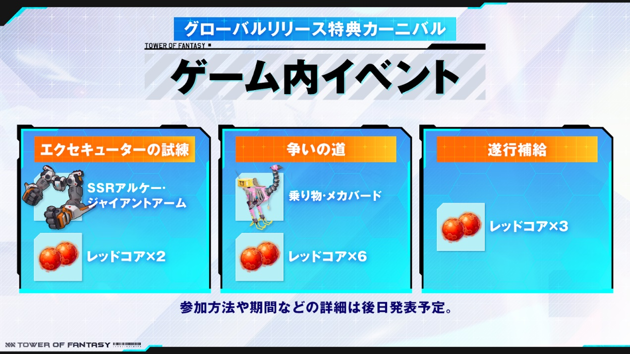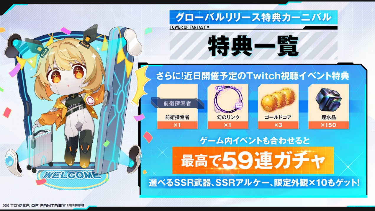 正式サービス開始を祝うため、記念イベント「幻塔リリースカーニバル」を開催しています。参加すると、無料ガチャを最大59連も引けるチャンスが入手できます!このほかにも、ゲームプレイに役立つアイテムをタップリご用意しています。例えば、「選べるSSR武器」や「SSRアルケー」、「限定外観」x10をもらえます!是非お見逃しなくゲーム内でチェックしてください!スタートダッシュに乗り遅れないよう、一日も早くゲームを始めましょう!