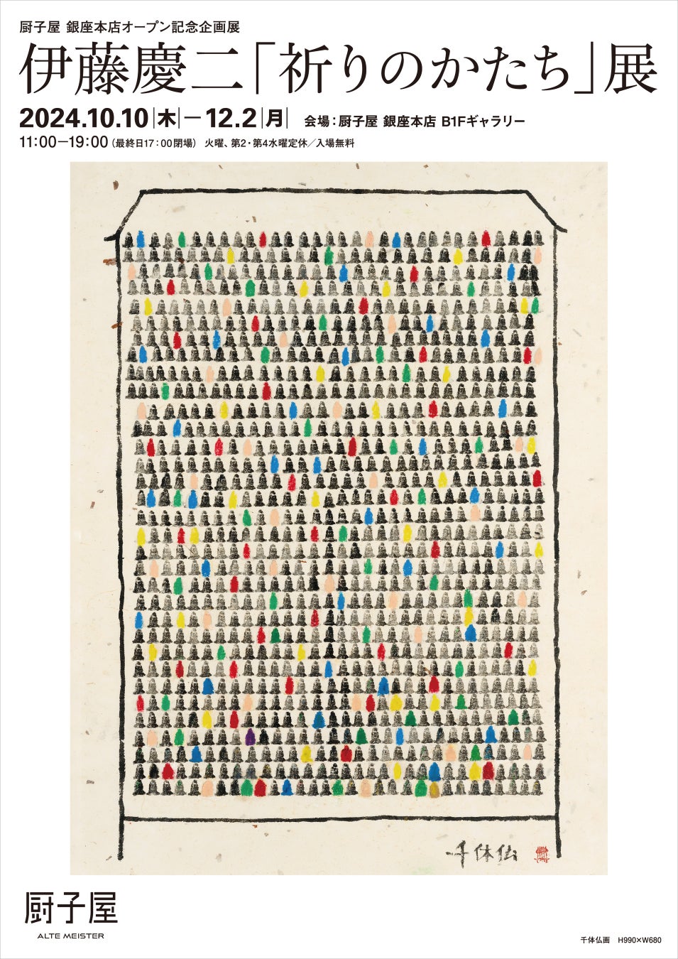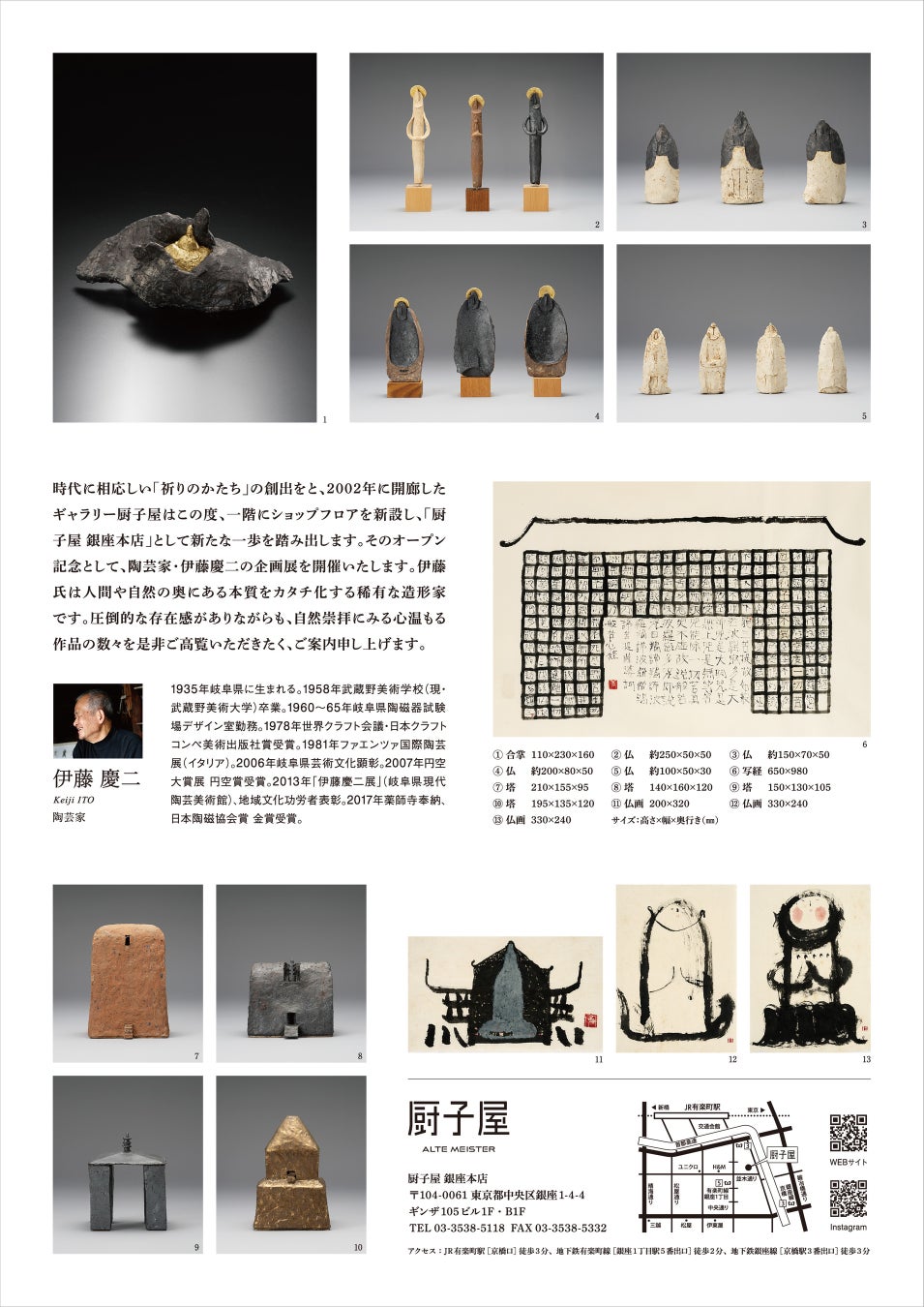 この度、一階ショップの新設に伴い「厨子屋 銀座本店」に生まれ変わるオープン記念として、陶芸家・伊藤慶二の企画展を開催いたします。伊藤氏は人間や自然の内面にある本質をかたちにする稀有な造形家です。圧倒的な存在感がありながらも、自然崇拝にみる心温もる作品の数々。是非ご高覧ください。