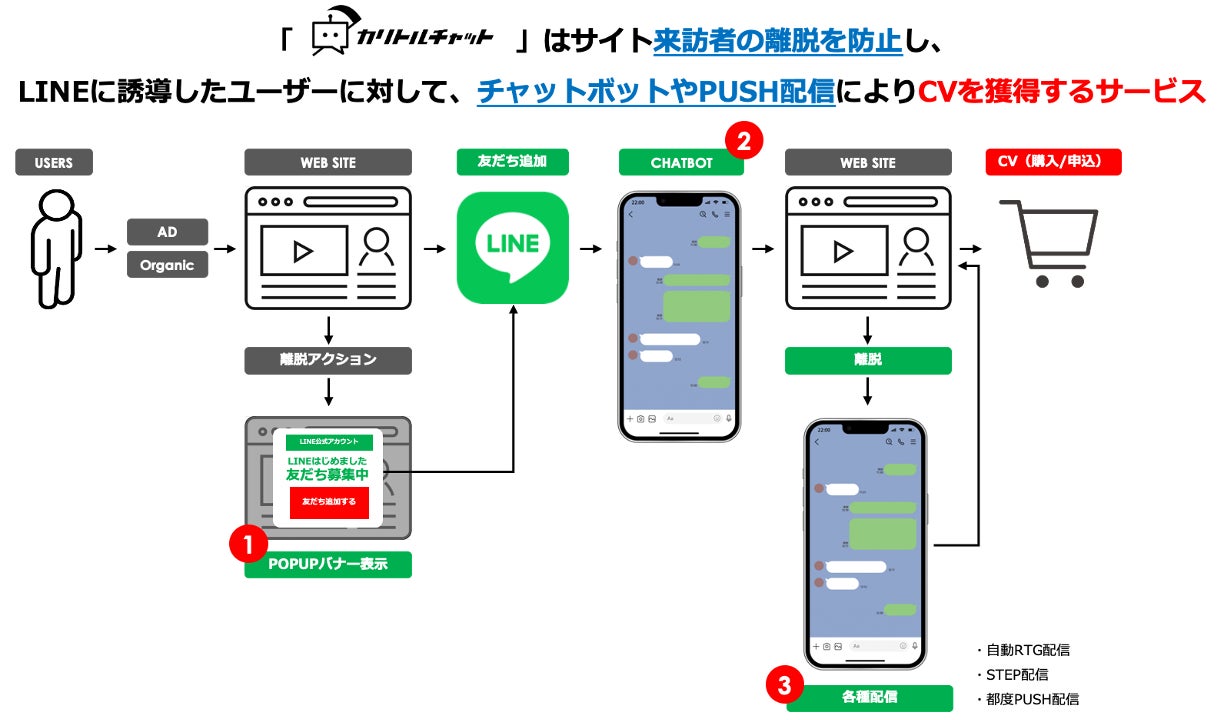 「カリトルチャット」は、LINE公式アカウントを活用して、サイト離脱を防ぐバナーを訪問者の離脱タイミングで掲示し、LINE公式アカウントへの誘導を行います。誘導後、当社が企画・設計・制作したチャットボットが接客を行い、訪問者のサービス理解を深め、態度変容を促進することで、成果へと導きます。