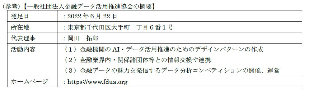 みずほリースは、経営理念において、Challenge(挑戦)、Change(変革)、Create(創造)に、Collaborate (協働)を掛けあわせ、社内外のさまざまなステークホルダーとの連携や協働により、大きな創造効果を生み出すことを行動指針として掲げています。この度のFDUAへの加盟を通じて、データ利活用により新たな価値を創造し、顧客体験の向上を図りながら、社会・経済をより豊かなものにしていく為の取組と、それを実現するための人材育成を加速させていきます。