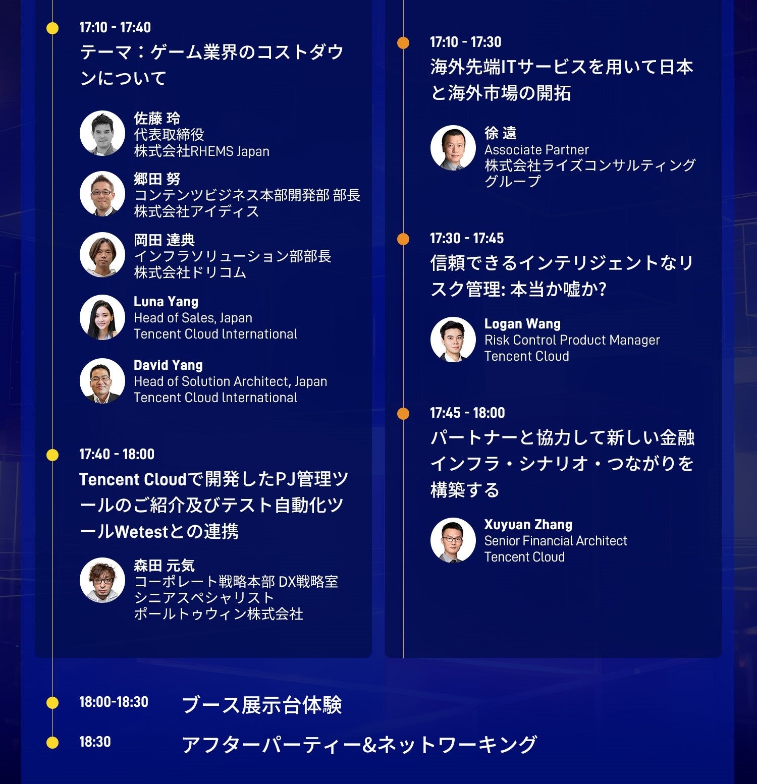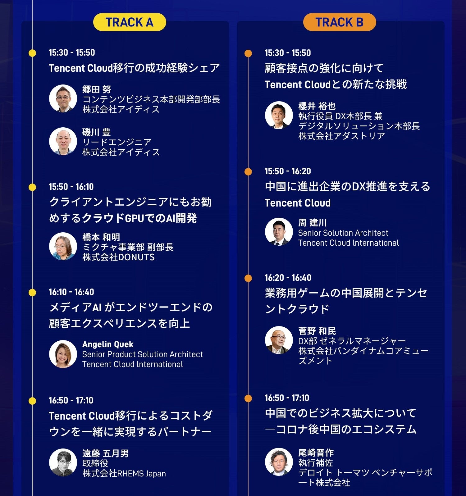 今回決定したコンテンツには、「Tencent Cloudへの移行に関する成功経験シェア」や「ゲーム業界のコストダウンについて」、「クライアントエンジニアにもお勧めするAIコンピューティングの為のネットワーク最適化」等、ゲーム・エンタメ・エンタプライズ業界において注目の内容が多数揃っており、参加者の皆さまにより魅力的なコンテンツを提供致します。皆様のご参加をお待ちしております。