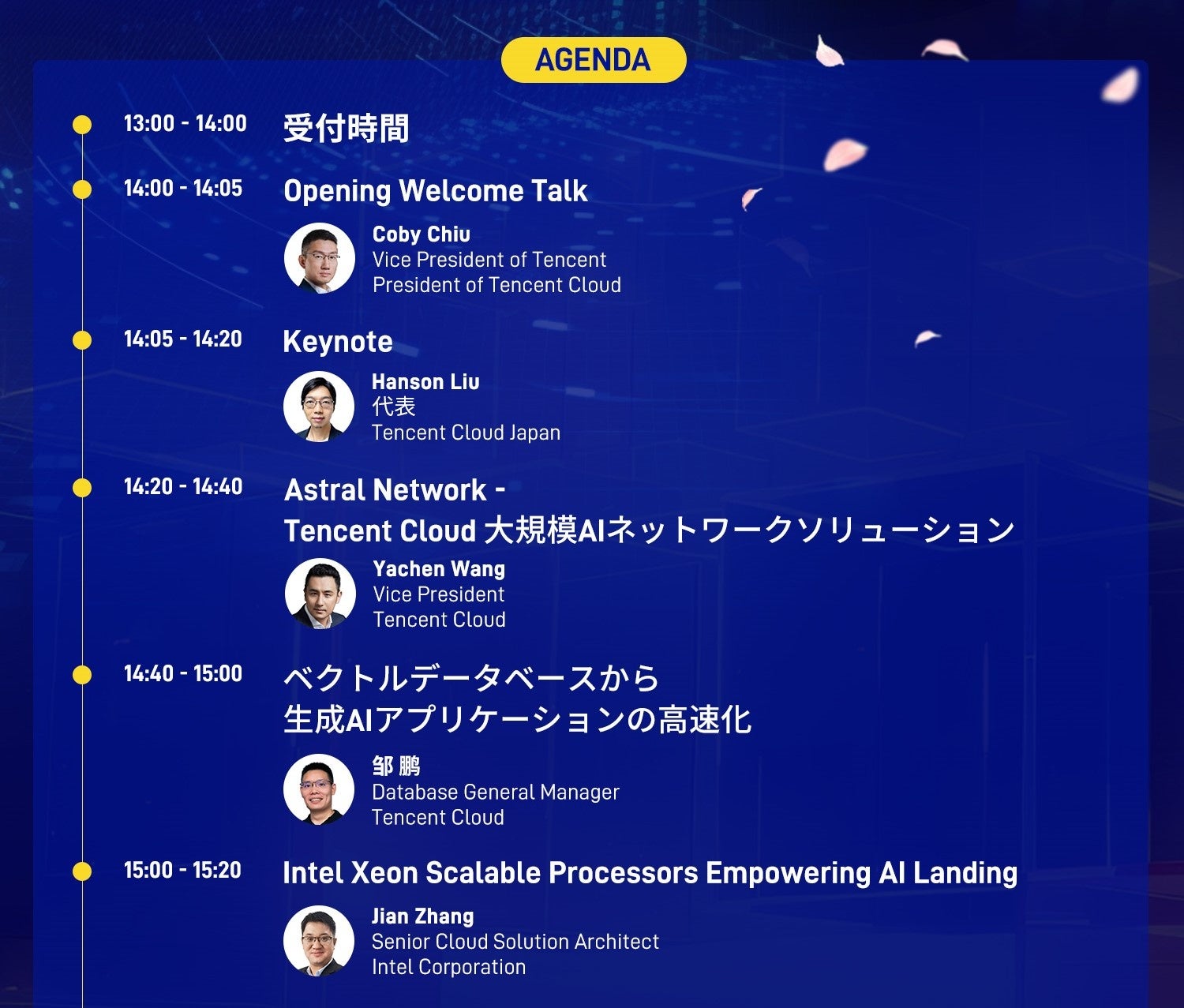 テンセントクラウドは現実世界の問題を解決する革新的なソリューションを生み出し、産業のデジタル化・スマート化への移行に注力しています。今回の「TENCENT CLOUD DAY JAPAN 2024」では、AIコンピューティングの為のネットワークを最適化することによる顧客体験の向上、コスト削減と効率化の追求、さらには中国市場進出のための戦略まで、幅広いテーマを扱います。併せて、Tencentクラウドサ一ビス最新のプロダクト情報の発表と、各専門家をゲストスピーカーに迎え、最新の業界の動向や新世代ビジネスの可能性をご紹介致します。
