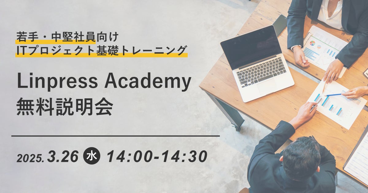 株式会社リンプレス(本社:東京都港区、代表取締役社長:三宮壮、以下「リンプレス」)は、全6回でデジタル・ITの基礎知識やITプロジェクト実践に役立つスキルが網羅的に学べるIT基礎トレーニングコース「Linpress Academy」を2025年5月から開催いたします。