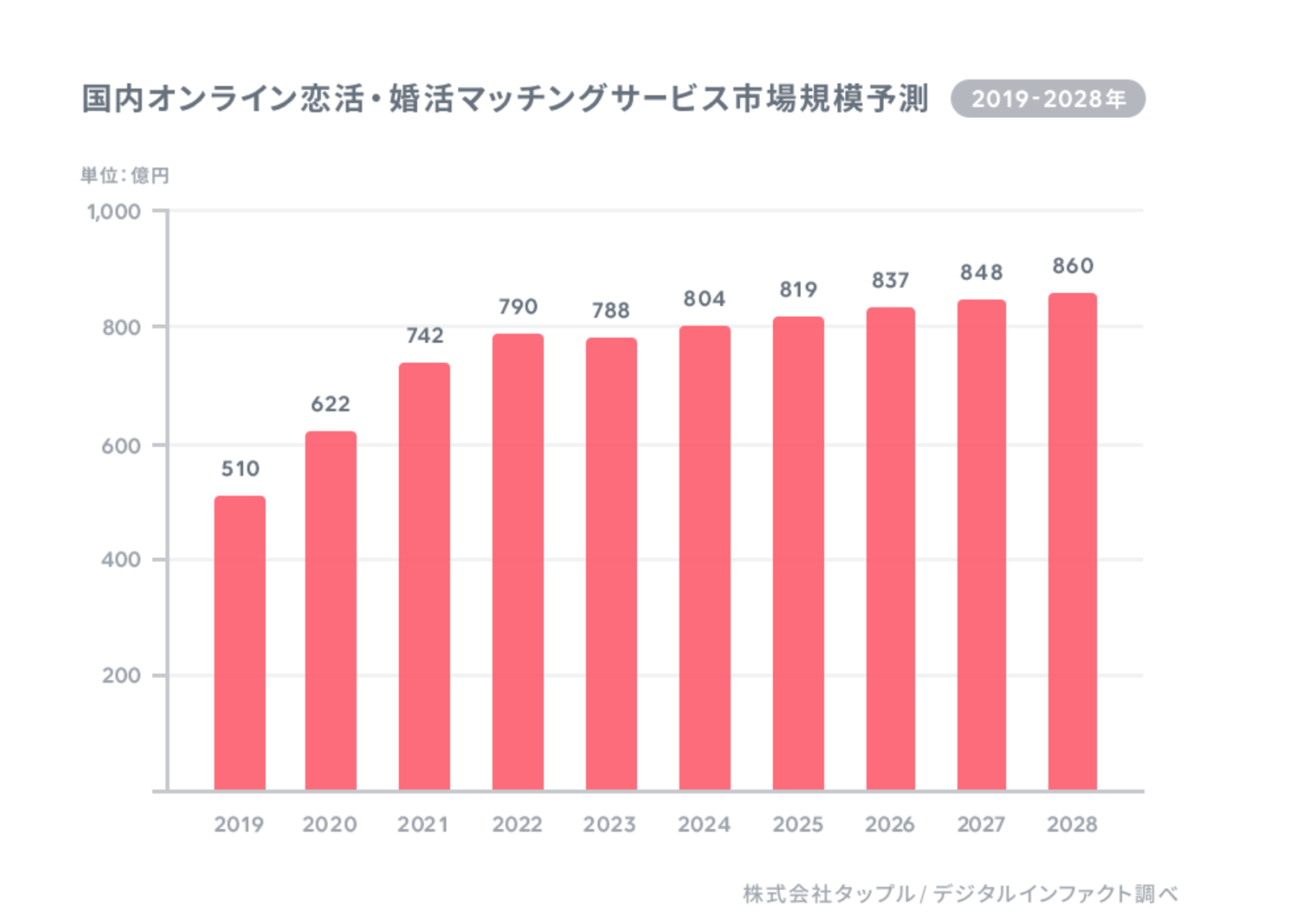 タップルが実施した国内オンライン恋活婚活マッチングサービスの市場調査(*1)によると、2023年度の市場規模は788億円の見通し、2028年には860億円に拡大すると予測されています。