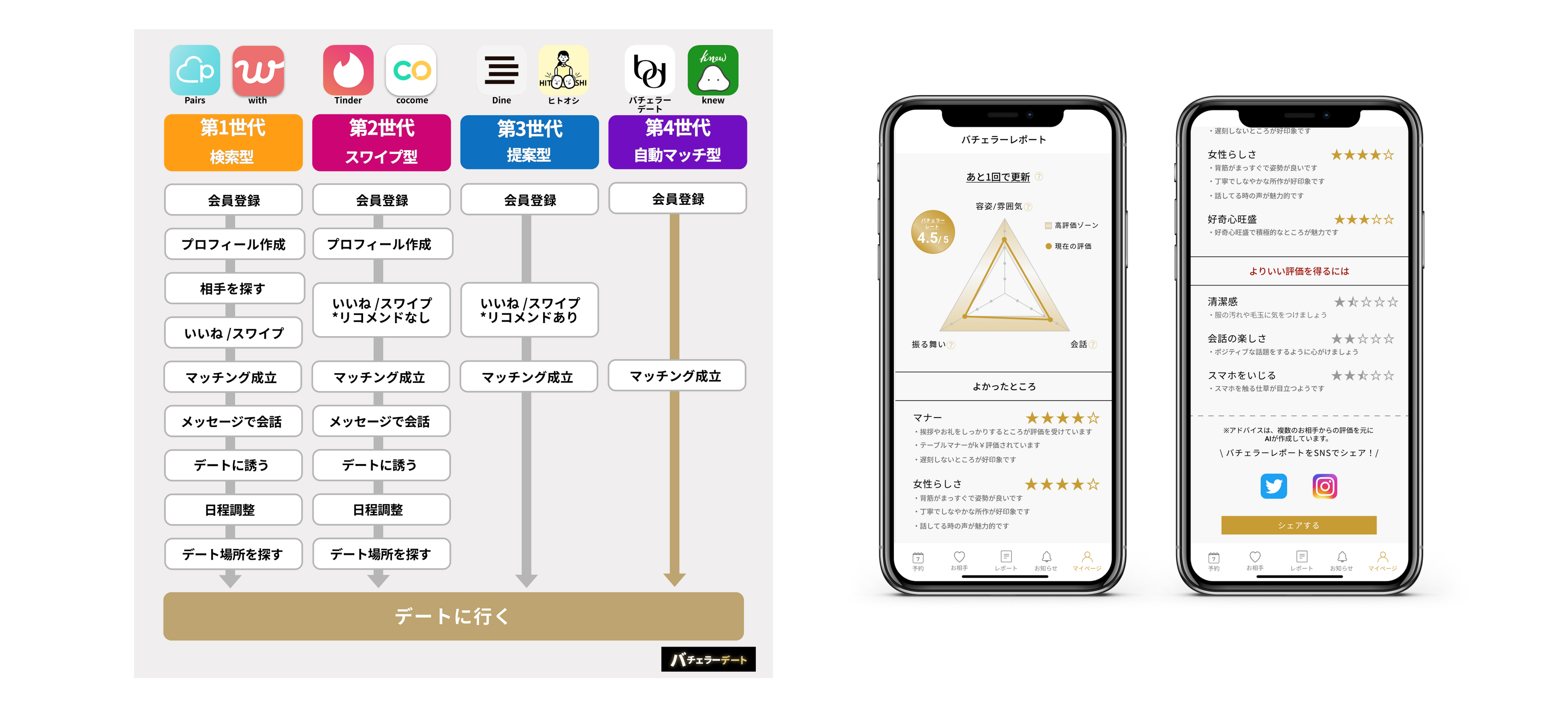 コロナ禍の約3年は自身を見つめ直す時間となった人も少なくないと思います。本当に自分に合った人との出会いを求める場合、まずは自己を正しく理解し価値を把握する必要があると考えます。「バチェラーデート」では、マッチングアプリでは本来知り得ないデート相手からの評価を「レポート」として受け取り、知ることも可能です。こうした機能を実装するサービスも増えてきており、自分では気づくことのなかった長所が可視化され、自己肯定感がUPしたり、短所を改善しより魅力的な自分になることができます。今後はお相手探しだけでなく、新しい発見や自己成長ができる付加価値も求められてくると予測します。