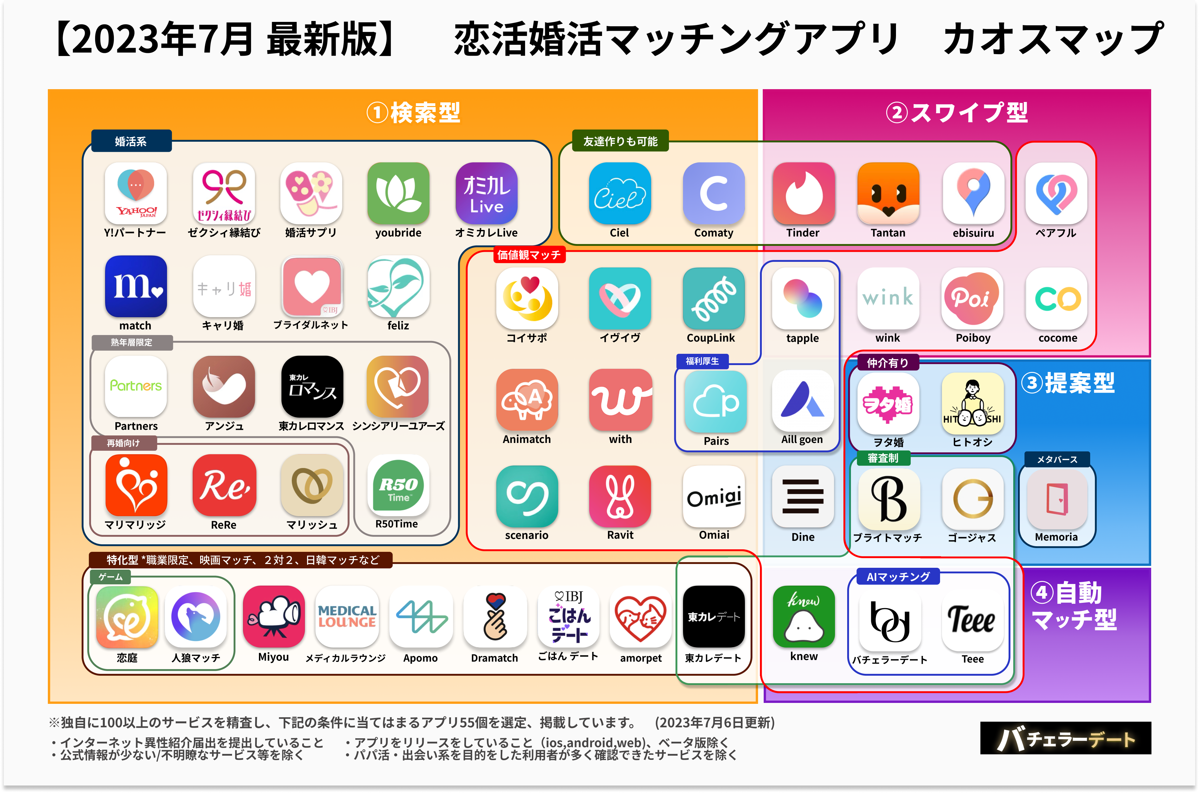 バチェラーデートでは、マッチングアプリのお相手の探し方に着目し、お相手条件を絞り込み検索で探す第1世代、写真をスワイプして相手を探す第2世代、運営やサービスがお相手を複数人提案した中から選ぶ第3世代、探す手間がない自動マッチングの第4世代に分けてカオスマップを公開してきました。マッチングアプリ業界の変遷スピードは速く、前回の1月度版からわずか半年でのカオスマップ更新となります。