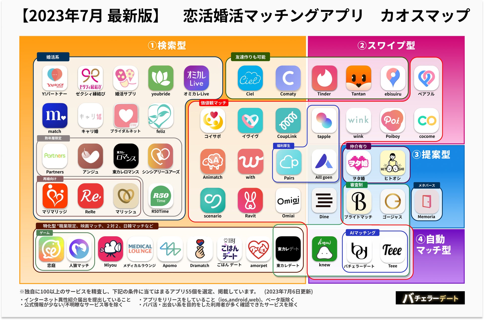 マッチングアプリ急拡大期もサービス生存率は約60% 7月度最新版”恋活婚活マッチングアプリ”カオスマップ公開