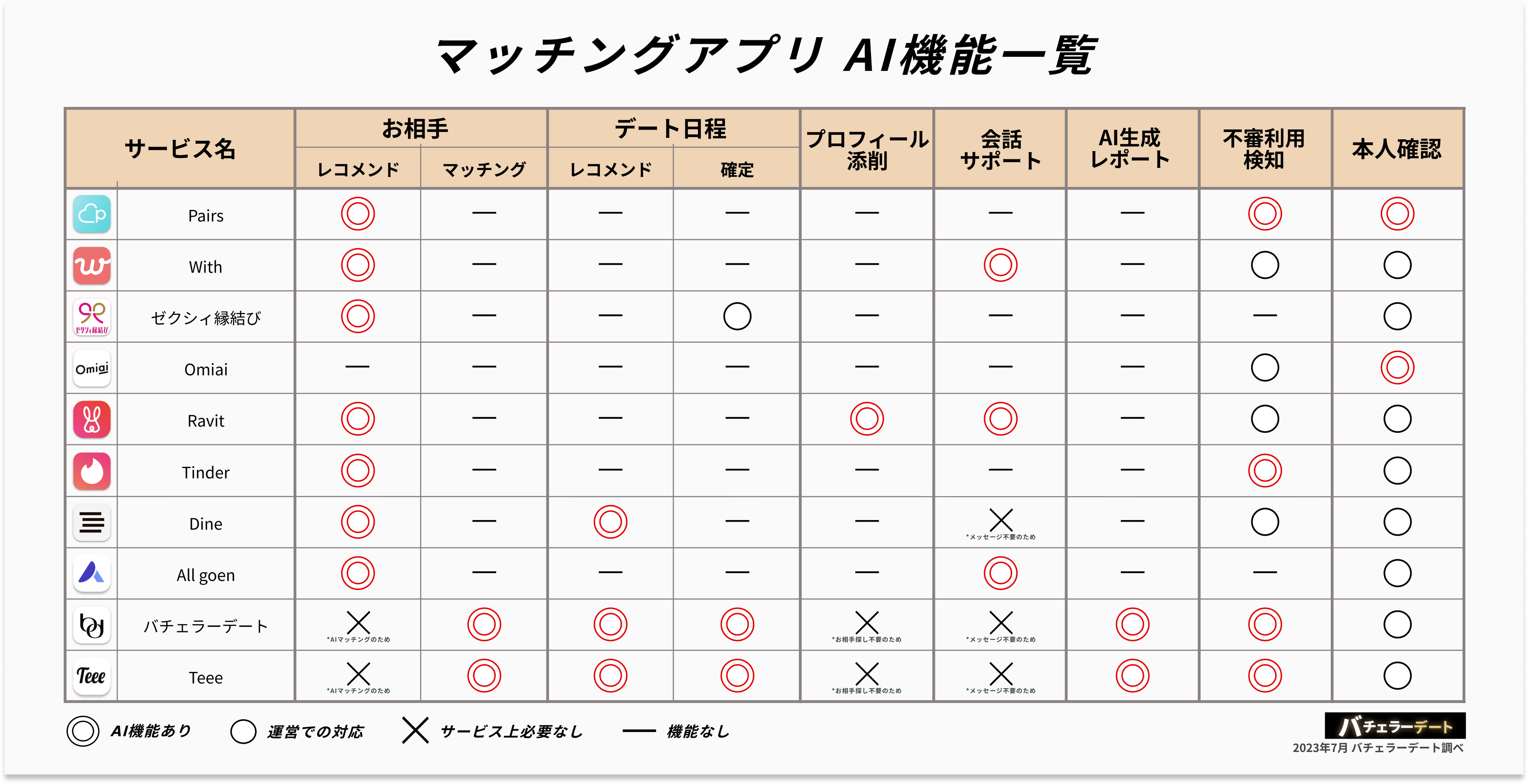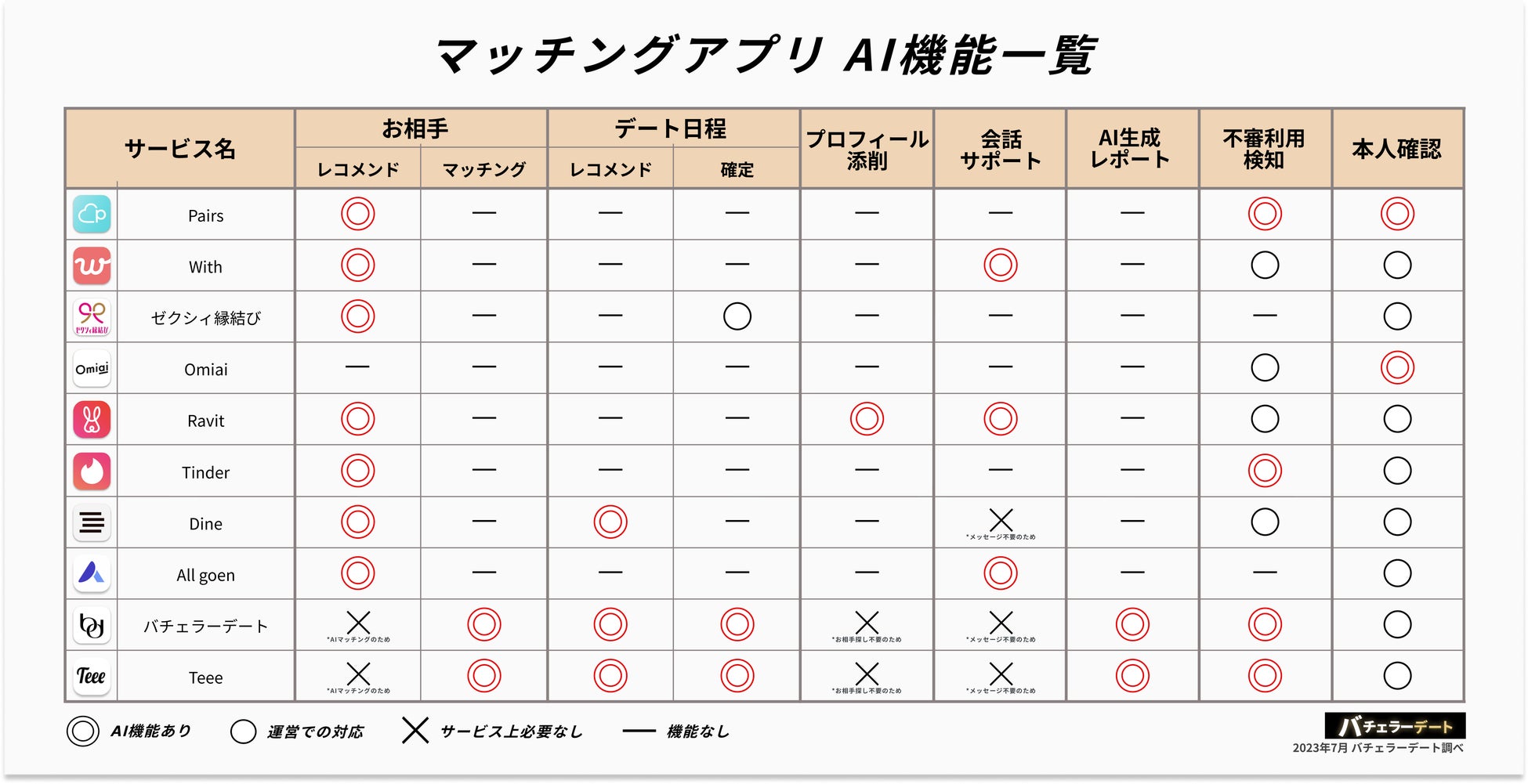 3つ目の特徴として、業界全体で増加の傾向が見られたのは、「AIの活用」です。AI機能に関しては殆どの企業が取り入れています。今までは「不審ユーザーの検知」、「本人確認」「お相手レコメンド」などにAIが使用されていましたが、Chat GPTの出現も後押しし、「プロフィール添削」や「会話サポート」など、その活用の幅は広がってきています。今後も課題解決や、より効率的に恋活婚活ができるように様々なAI機能が実装され、AIの活用はサービス運営に必須不可欠なものになると予測します。