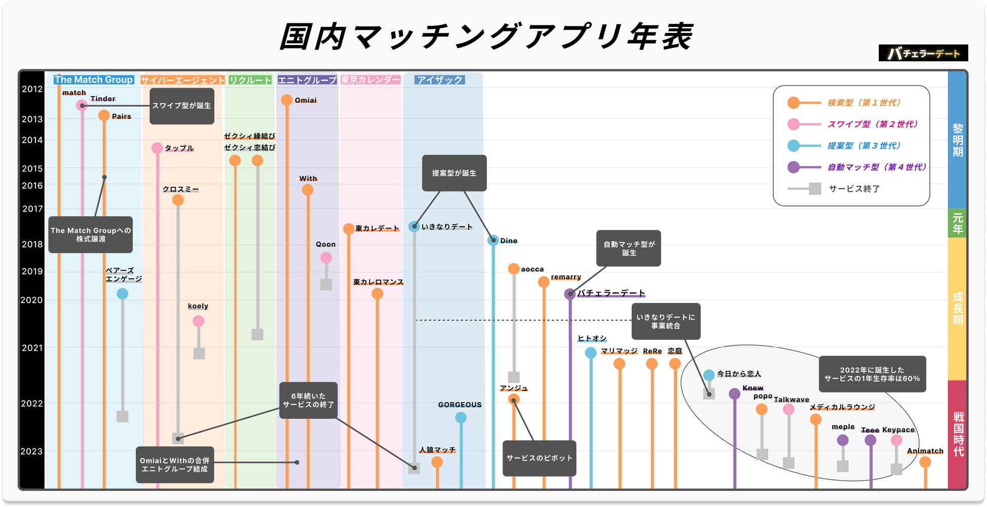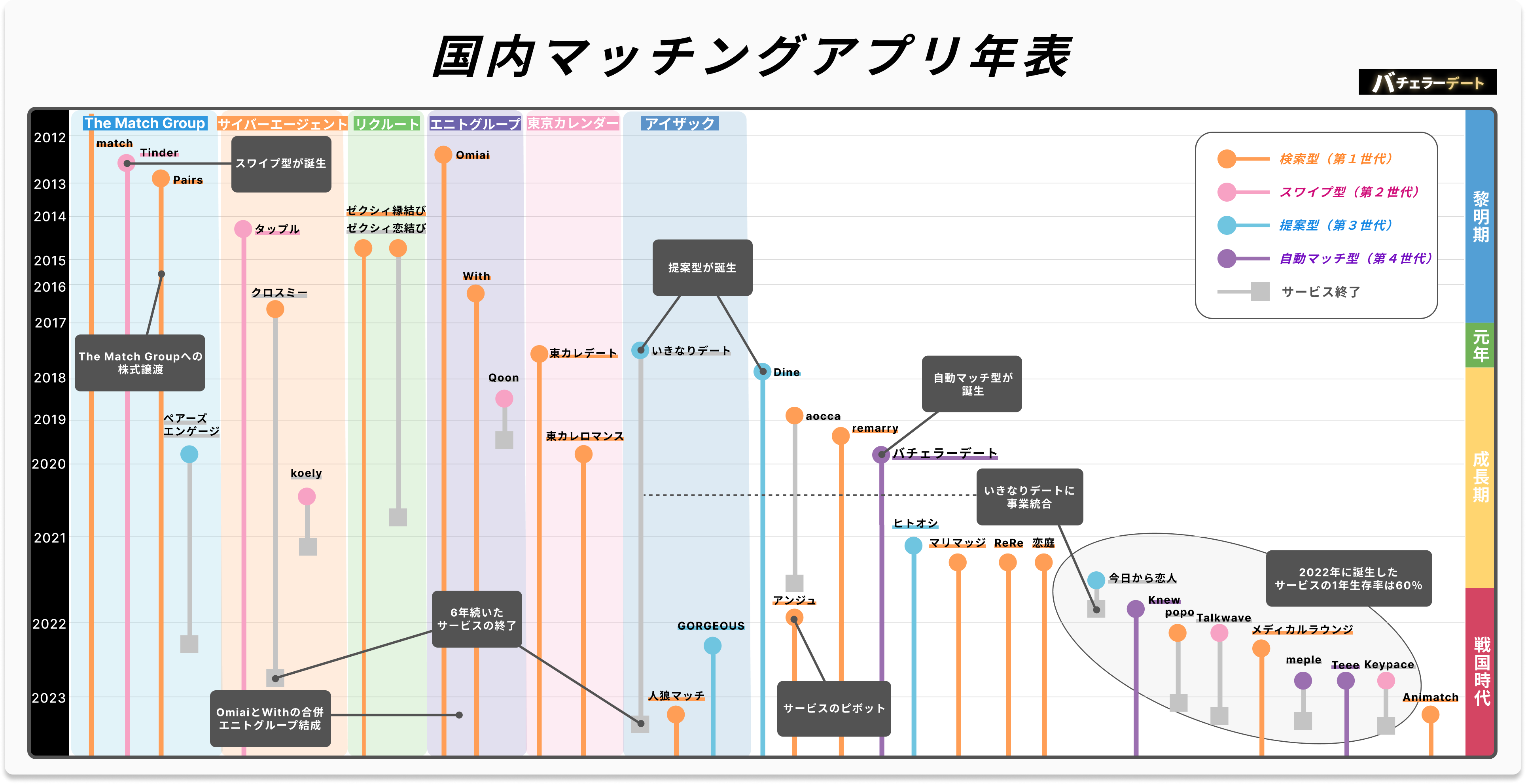 また、海外のマッチングアプリ市場で活発なM&Aの流れは日本にもきており、独占化・寡占化しやすい業界で運営の知見やノウハウを共有し、多様化するニーズに応えたり、事業運営の効率化を図ることを目的に、大手マッチングアプリのomiaiとwithが統合し大きなニュースにもなりました。