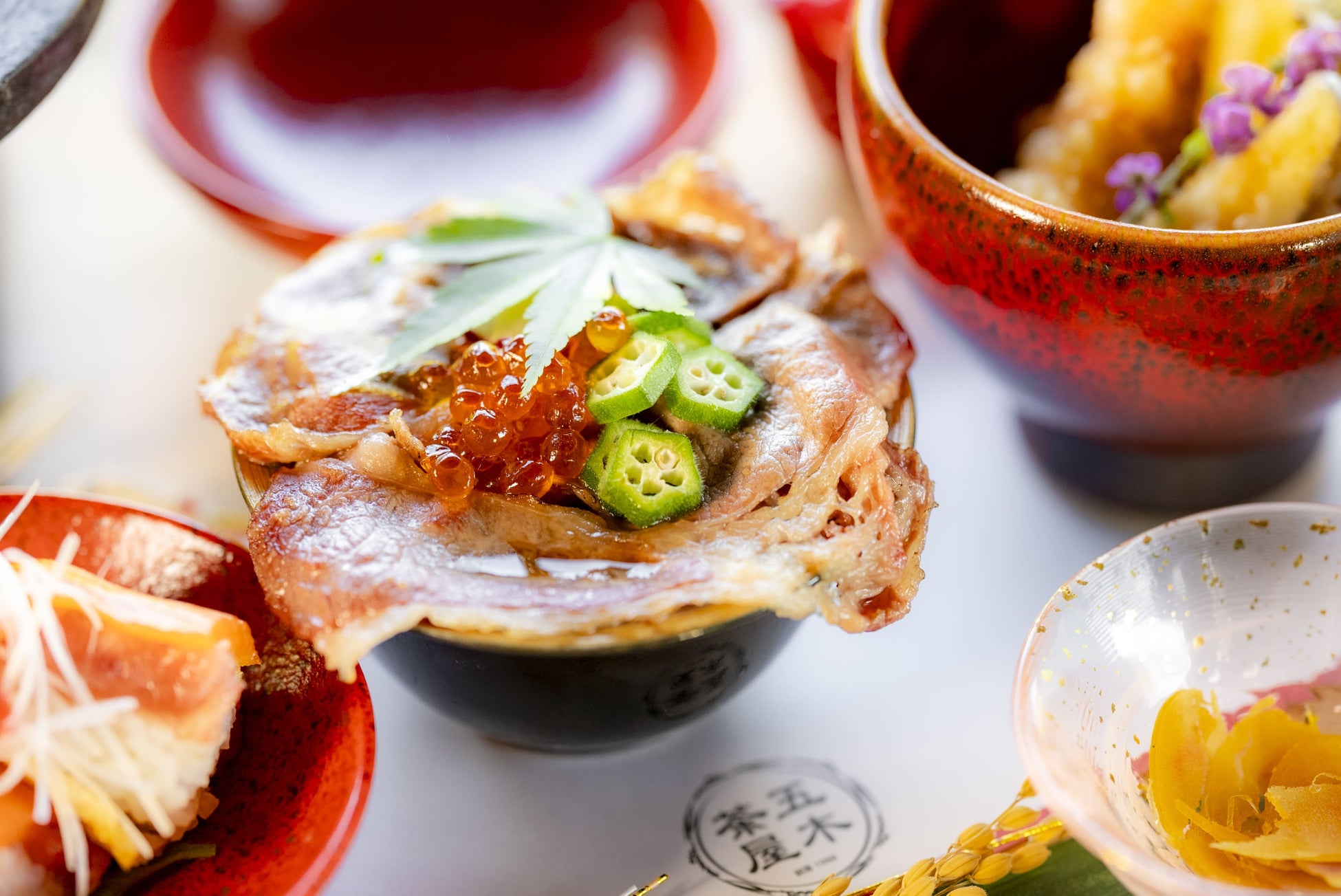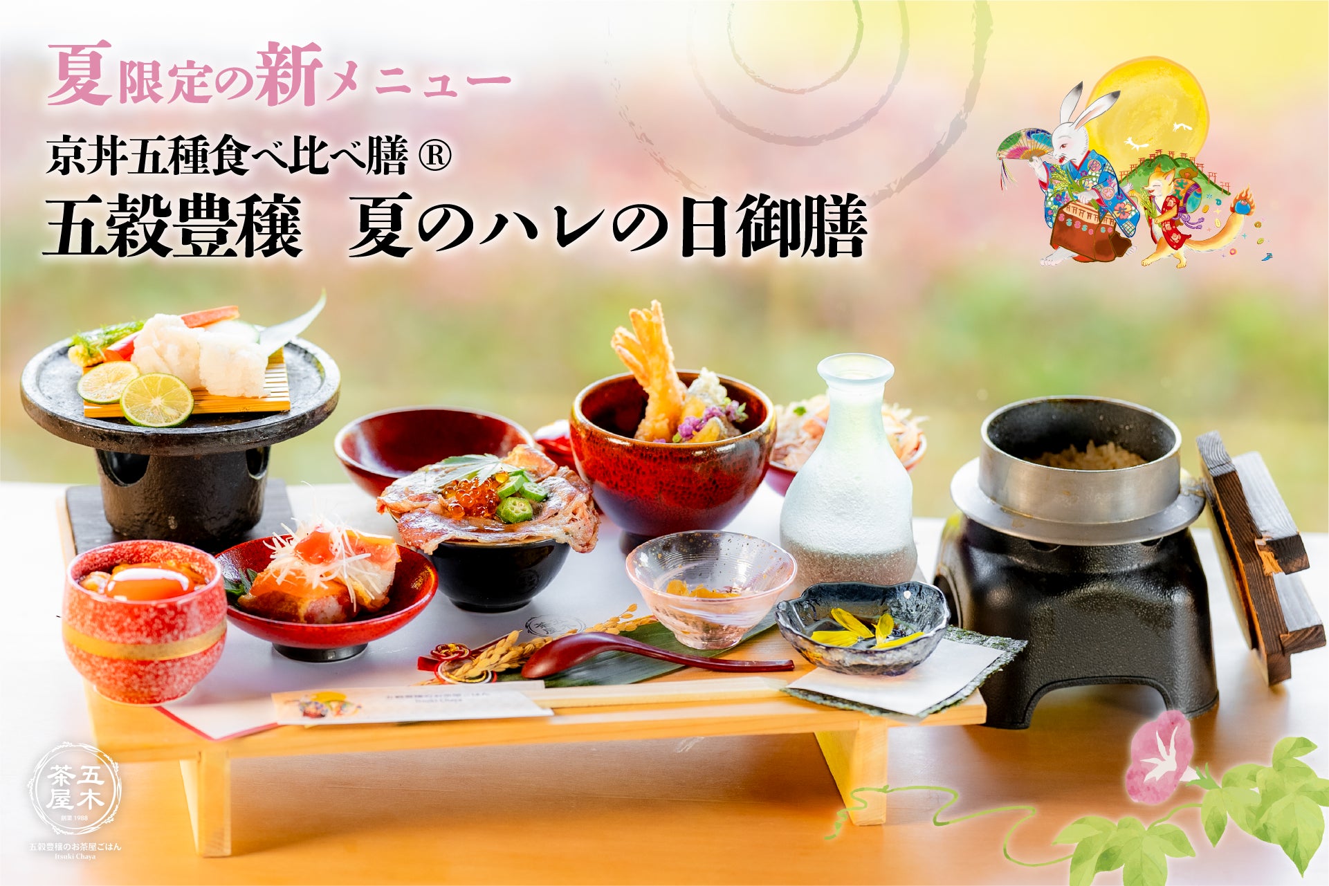 五穀豊穣のお茶屋ごはん®︎ 五木茶屋 伏見稲荷店では、厳選された夏の食材を使用した【夏の京丼五種食べ比べ膳】をご用意いたしました。