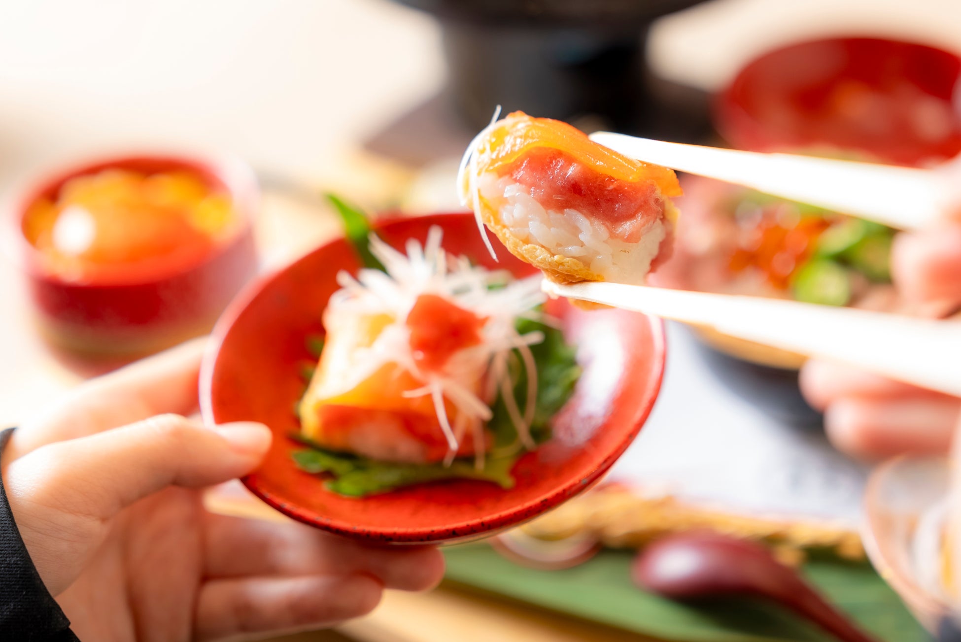 マグロのたたきを巻いたいなり寿司にサーモンといちじくのソースを添えました。