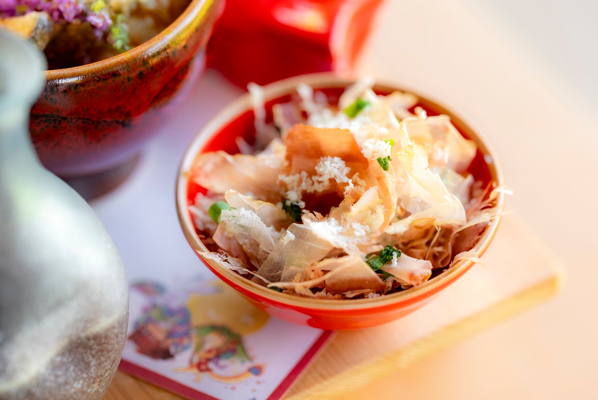 炊きたての釜飯と生削りの鰹節を使用しました。
