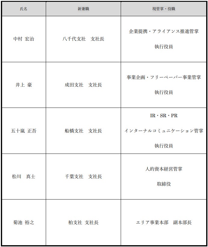 今回の人事異動は、当社のコアビジネスにおける業績を短期的かつ確実に向上させることを主な目的とするものです。その実現に向けて、取締役・執行役員・エリア事業本部副本部長が、5拠点の支社長を兼務することとしました。今回支社長を兼務するメンバーは、いずれも支社長としての実績を有し、経営視点と現場マネジメント力を併せ持つ人材です。経営層自らが現場の最前線に立ち、全戦力を投入するという強い覚悟のもと、より迅速かつ実効性の高い事業運営を推進してまいります。