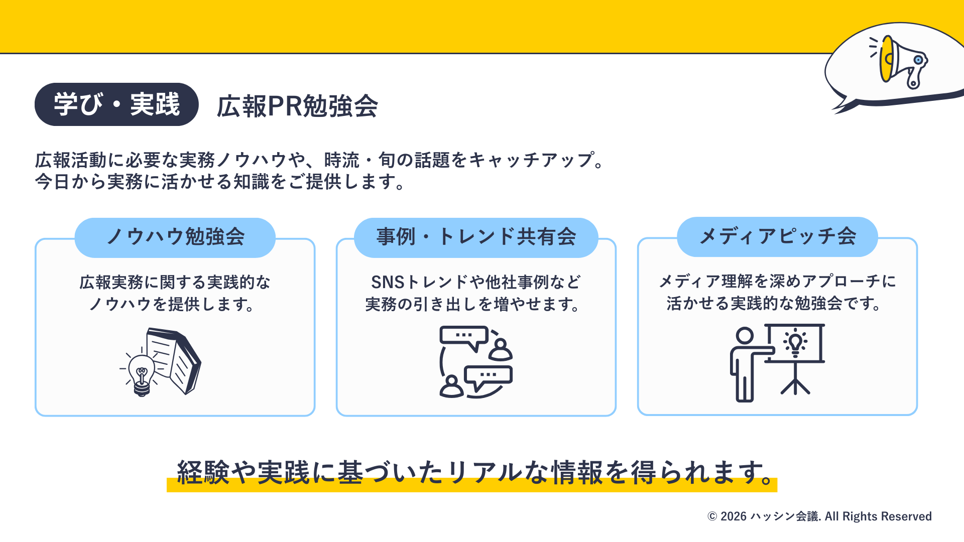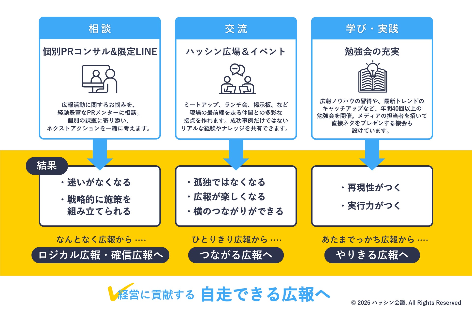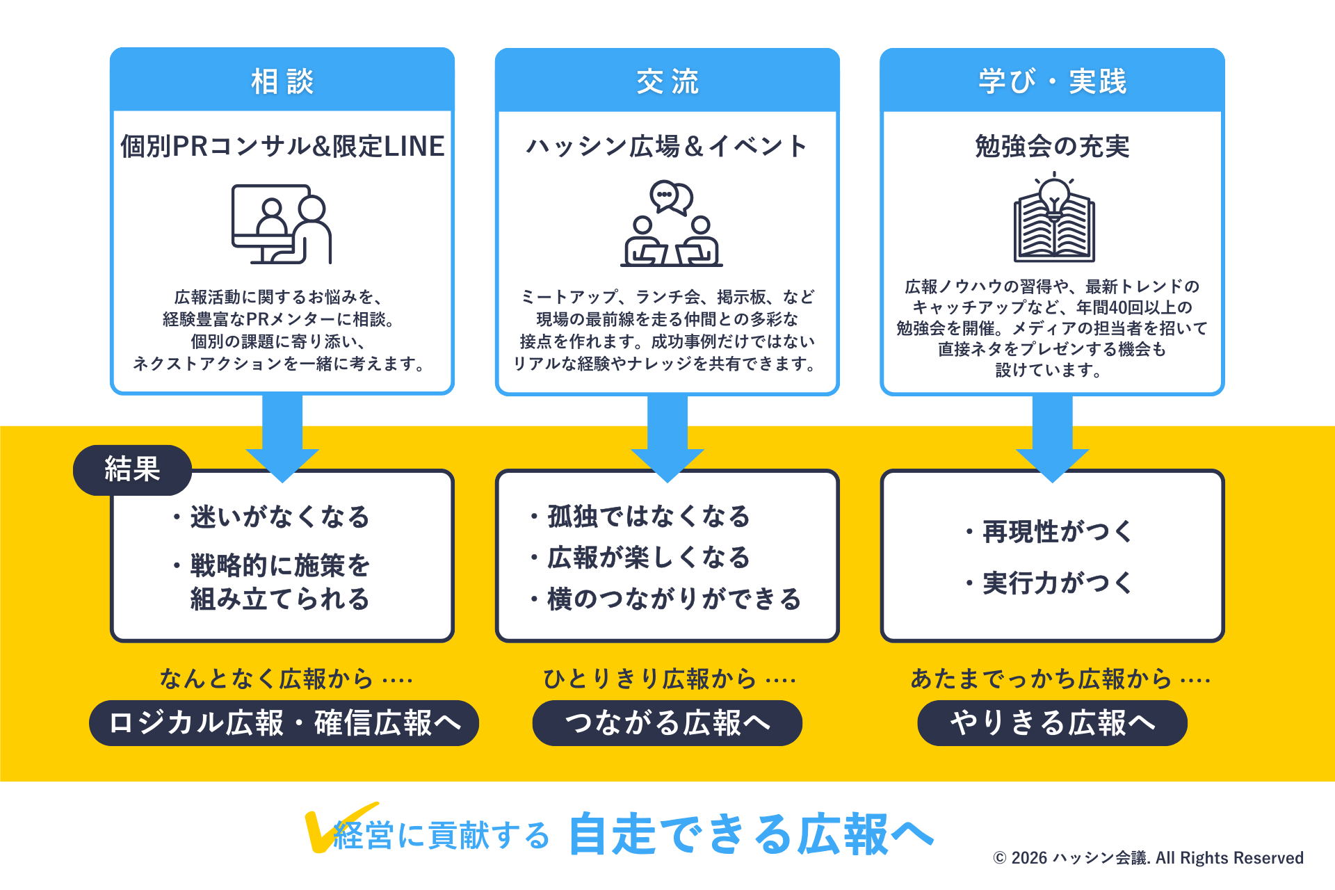 企業の広報組織づくりと広報人材育成を支援する株式会社ハッシン会議(本社:東京都港区、代表取締役 井上千絵、以下当社)は2026年2月、運営する「ハッシン会議PRコミュニティ(以下、コミュニティ)」に新たなサービスを追加しました。多様化する広報担当者のニーズに応えるため、相談/学び・実践/交流の3軸で、広報担当者の成長に寄り添うコミュニティへと進化し続けます。
