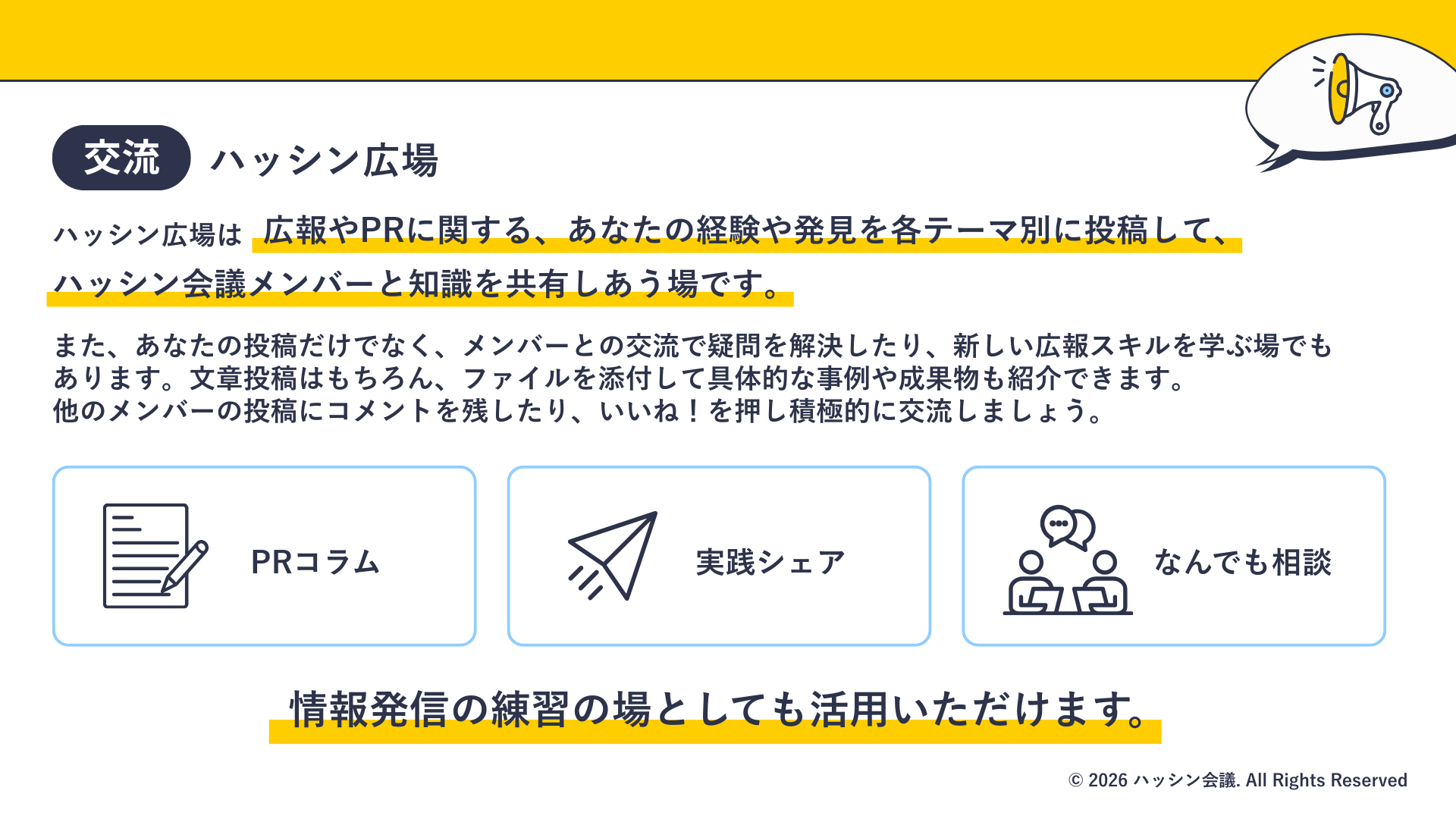 広報は経験値で動くことが多い職種です。ハッシン会議では、経験が十分でない会員のさまざまな困りごとに対応できるよう、コミュニティサービスを強化しました。