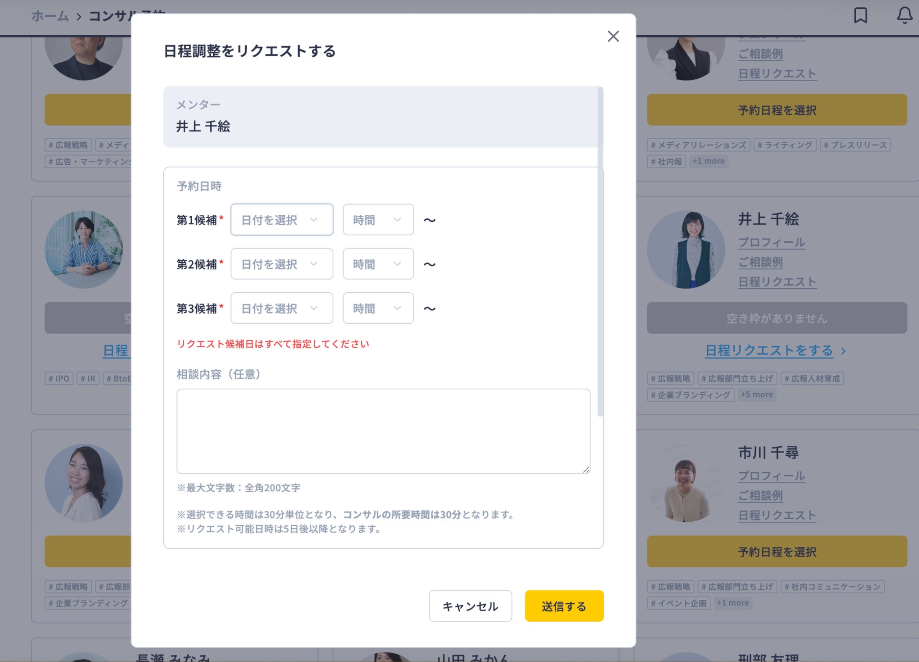 予約が取りやすくなるよう、これまでは候補日からの選択制だった個別PRコンサルに会員側からメンターに日程提案できる機能を追加しました。