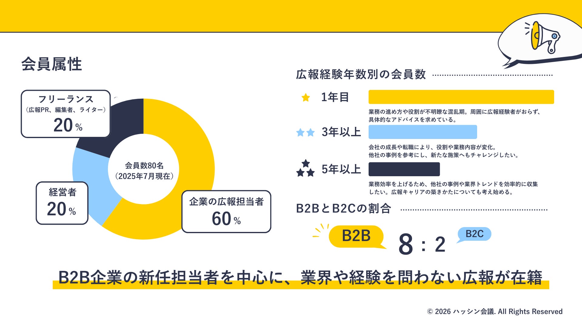 コミュニティには現在80名の広報担当者や経営者(以下、会員)が所属しています。新任の広報担当者(広報歴1年目前後)の参加が多く、会員の8割は、広報の手段に悩みを抱えやすいBtoB企業の広報担当者です。 (2026年2月時点)