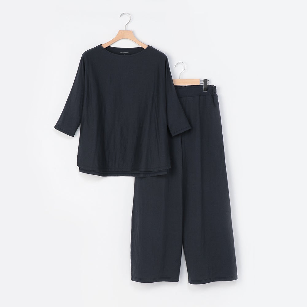 程よく開いたネックラインは首元をすっきり見せ、ゆとりある袖口で風を感じさわやかな着心地です。