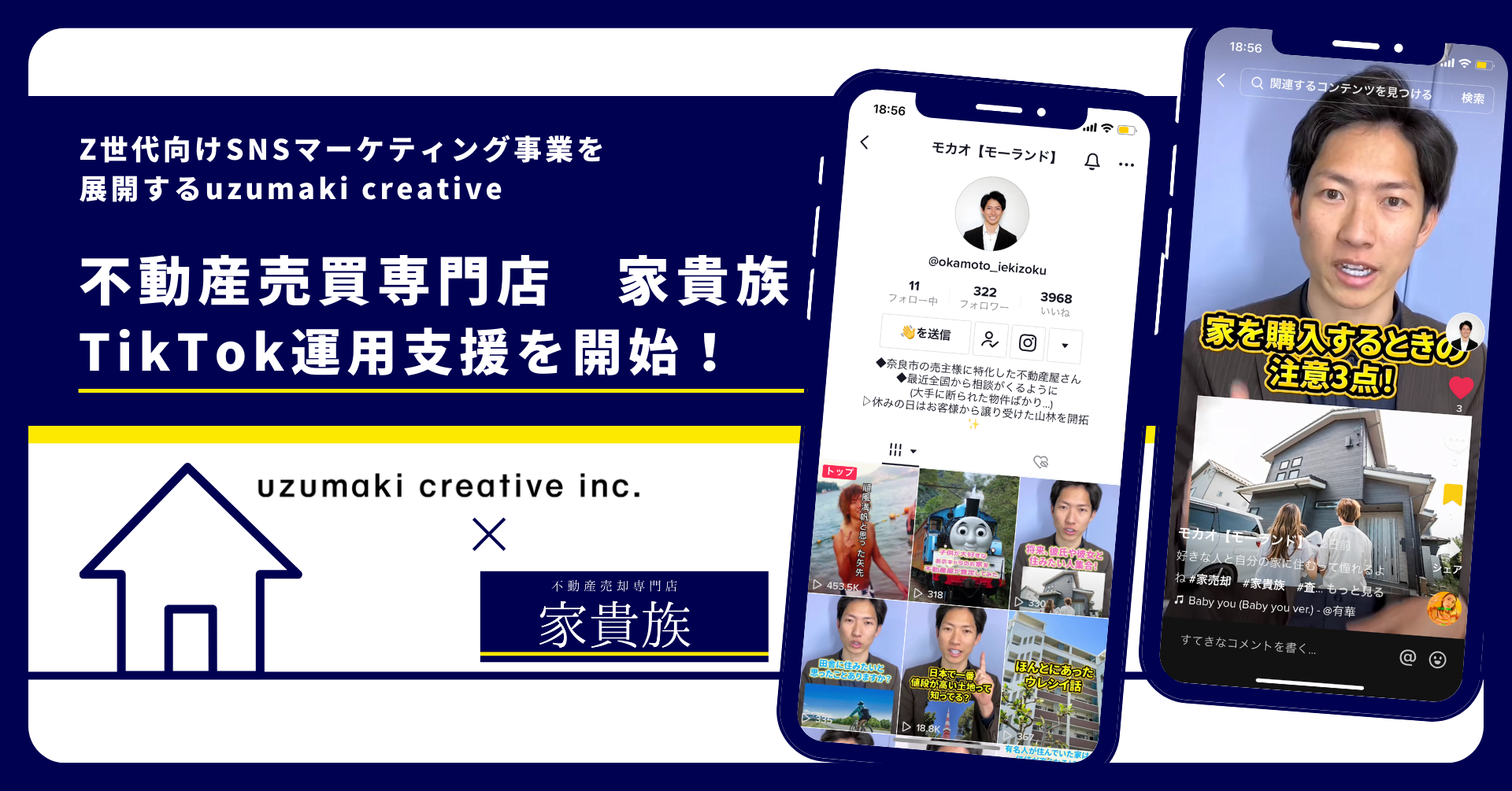 Z世代向けSNSマーケティング事業を展開する、株式会社uzumaki creative(本社:東京都渋谷区、代表取締役:木田陽真、以下:uzumaki creative)は、不動産売買専門店 家貴族(本社:奈良県 奈良市、代表:岡本博貴、以下 :家貴族)のTikTokの運用支援を開始いたしました。