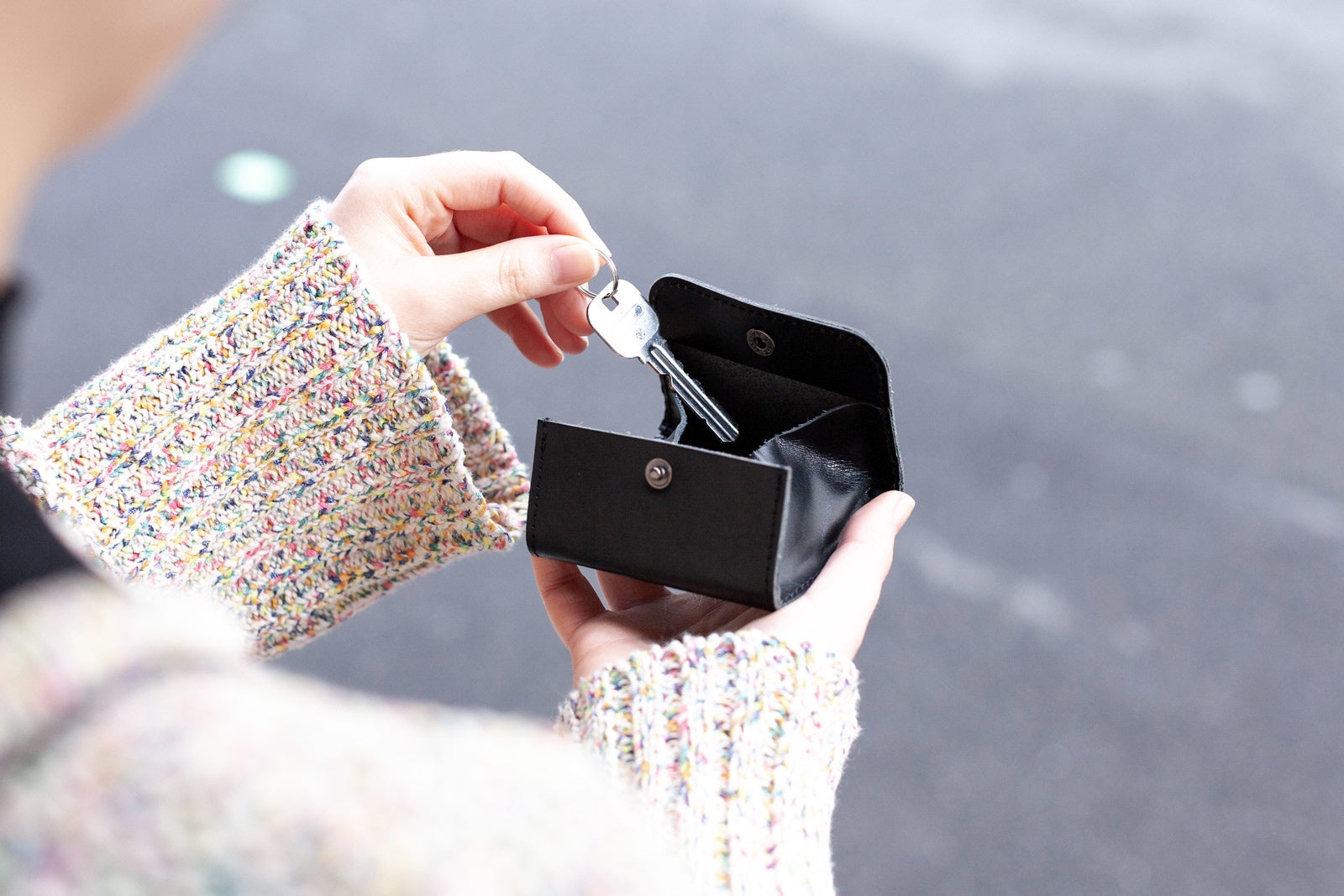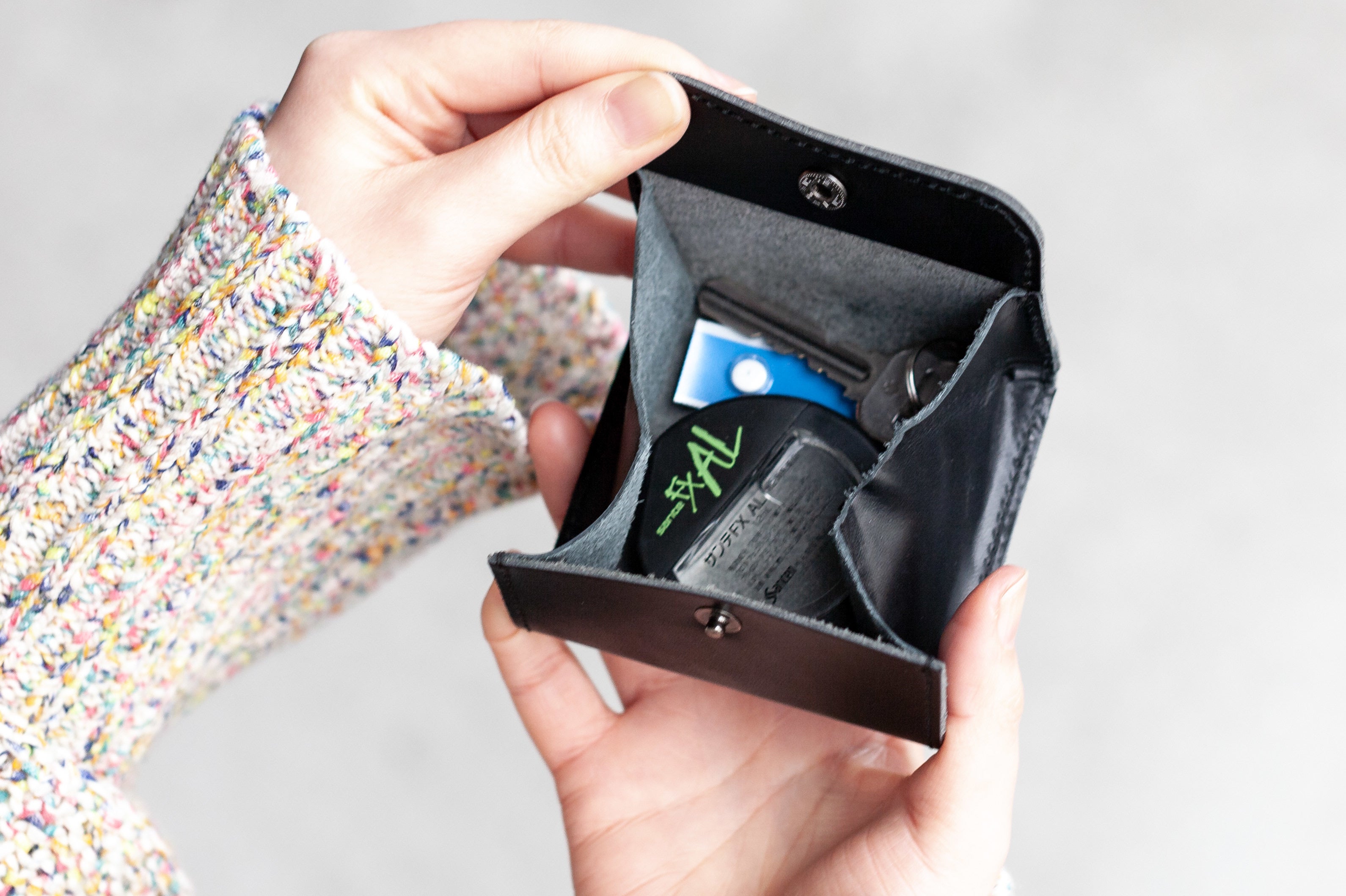 コインはもちろん、鍵や、花粉シーズンには嬉しい目薬ケースやピルケースのような使い方まで。マルチな使い方をできるように、サイズ感を徹底的にこだわり調整。いくつものサンプルを作成しながら革小物を作り続ける国内の工場とアイデアを出し合いながらものづくりを進めました。