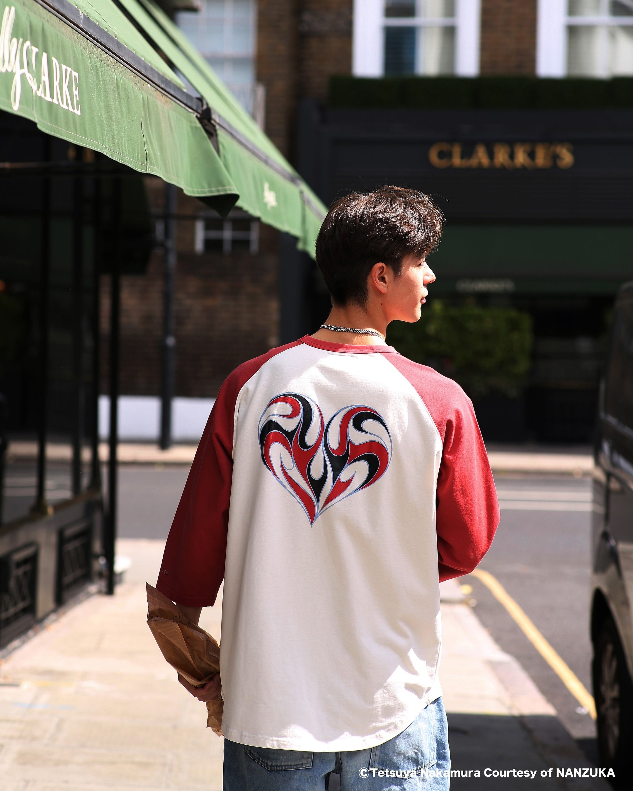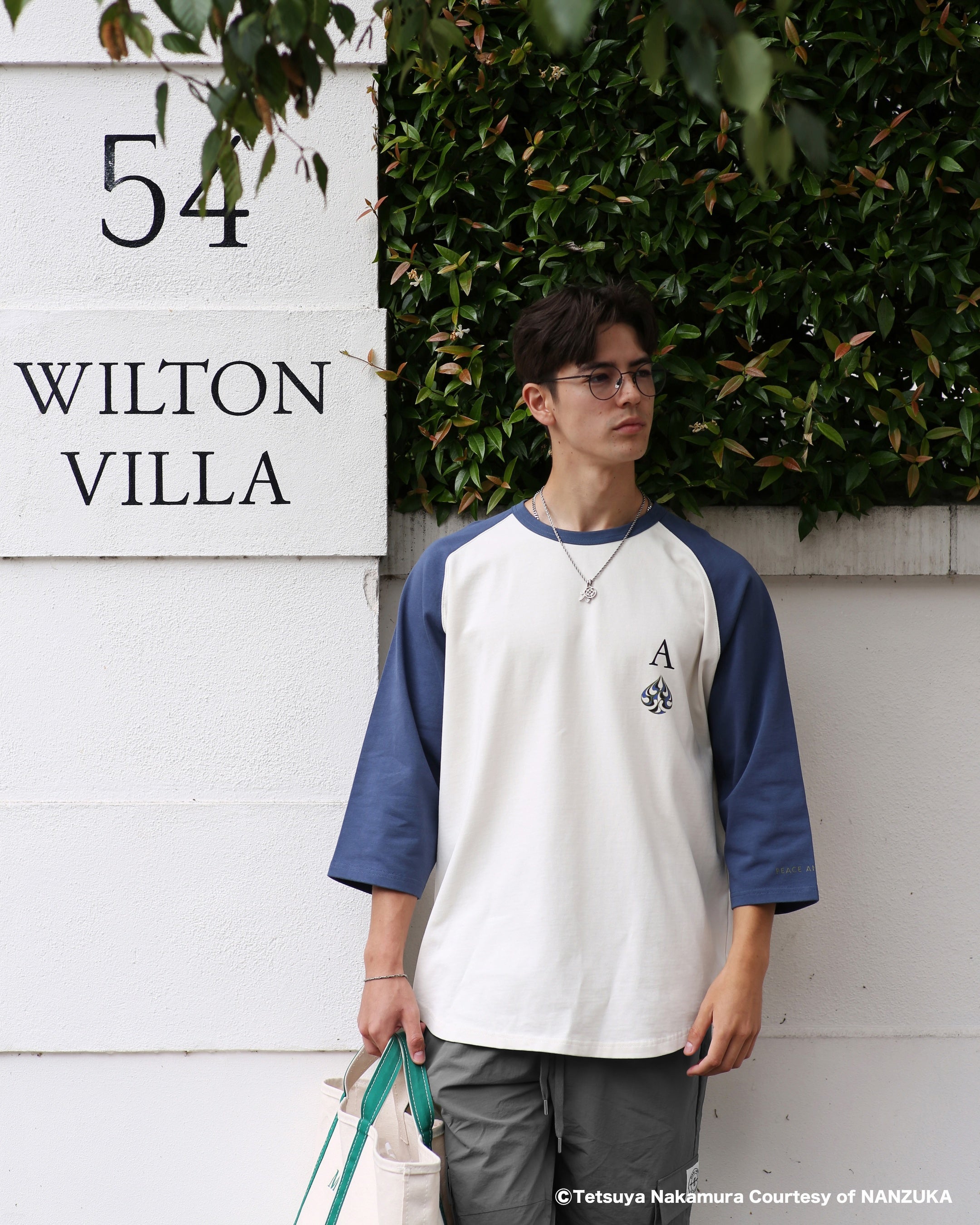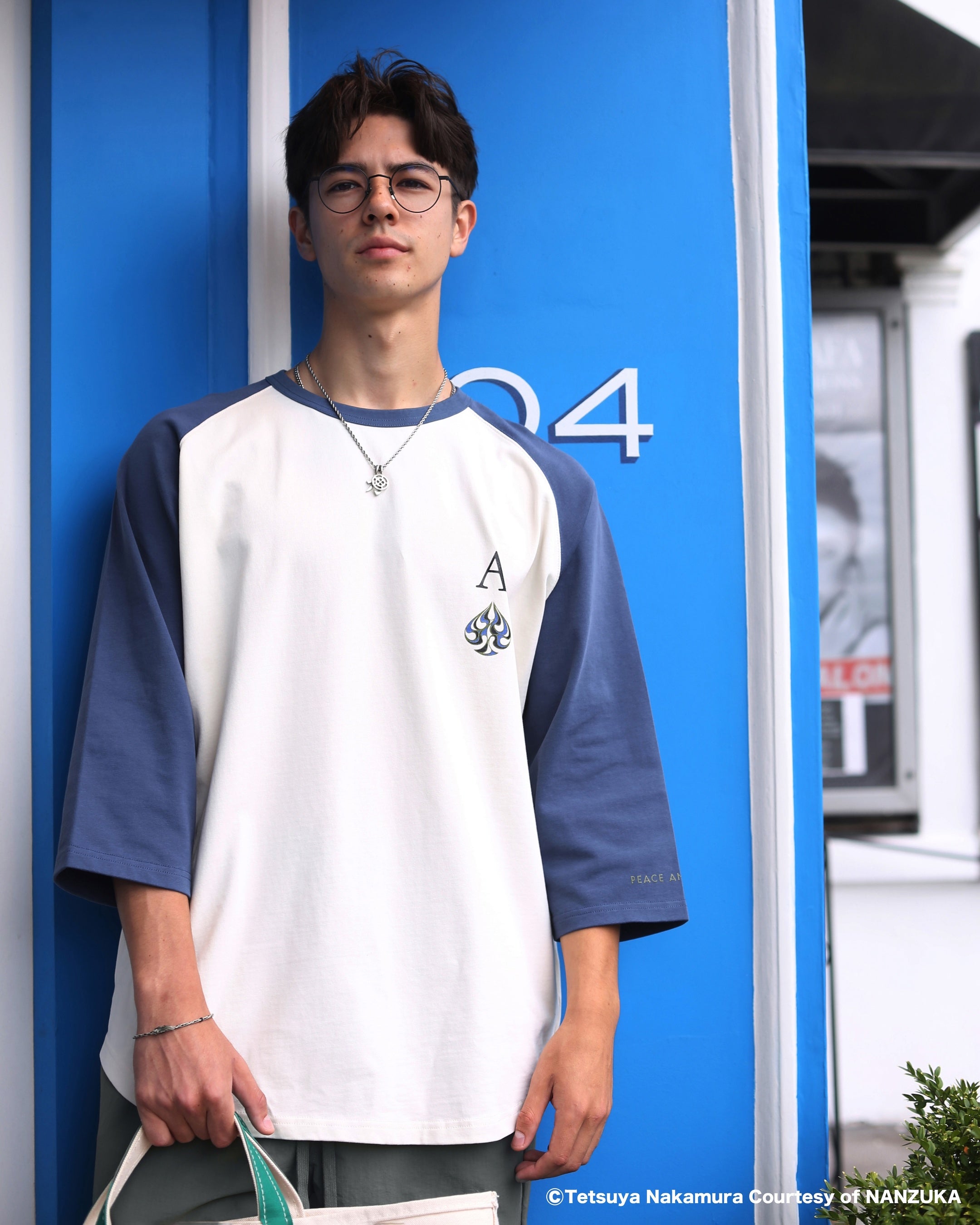 9.1oz.の厚みのあるコットン天竺素材を使用したオリジナルボディのラグランスリーブTシャツ。左胸・背面にトランプの柄からインスパイアされたモチーフをクラックプリントで表現したデザイン。袖丈は7分丈、襟・袖を身頃と配色を切り替え、裾はラウンドカット仕様。レギュラーフィットシルエット。2色S〜XLサイズ展開。¥16,500(Tax.in)