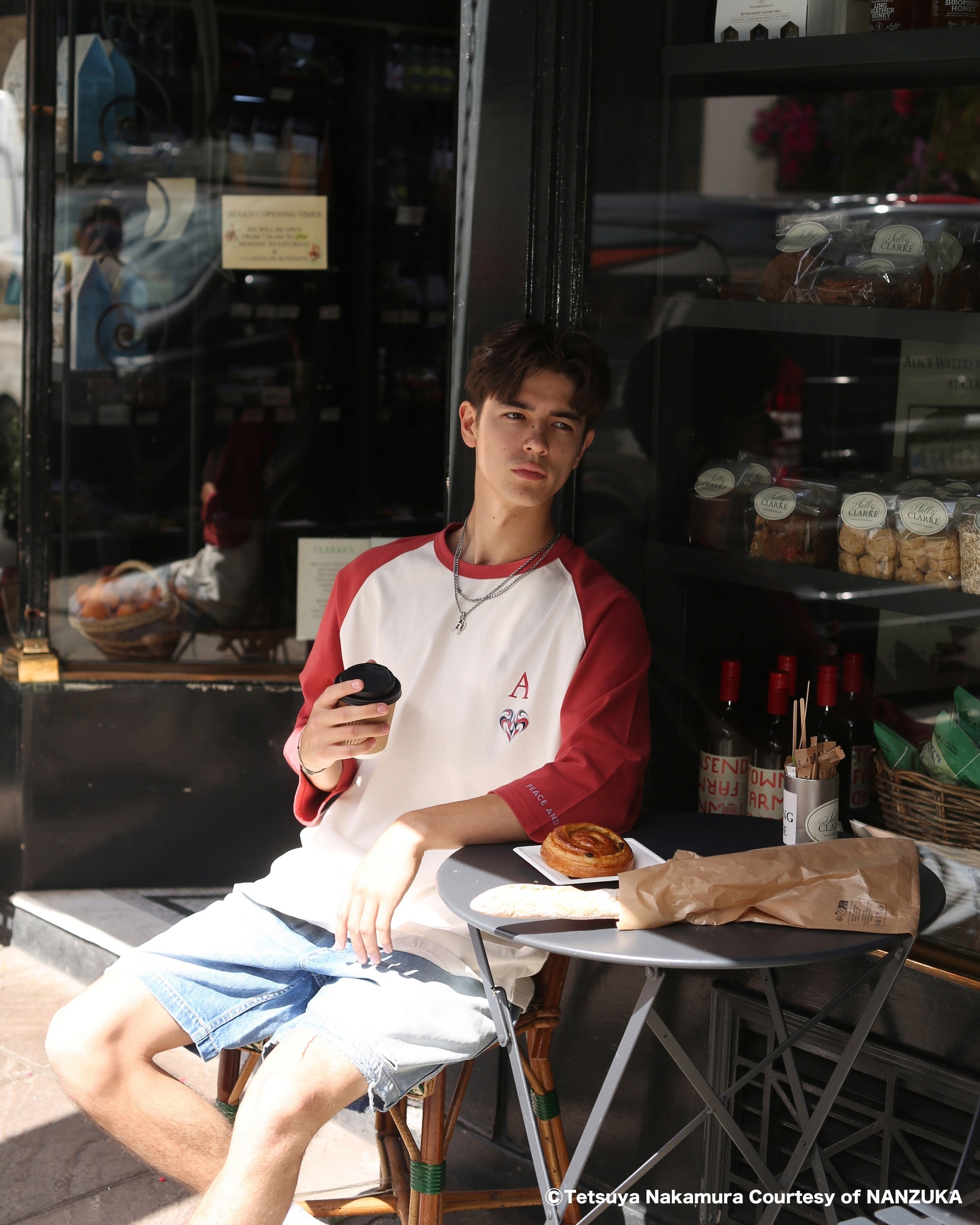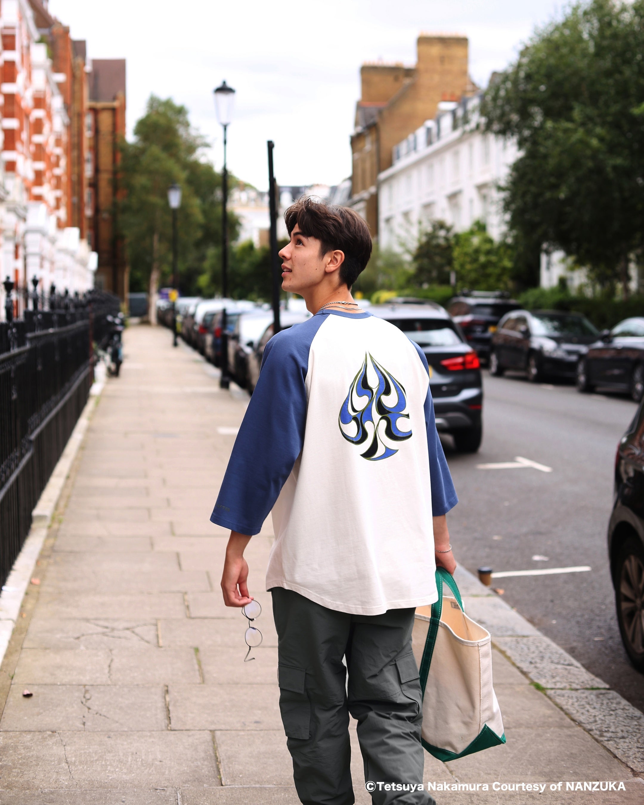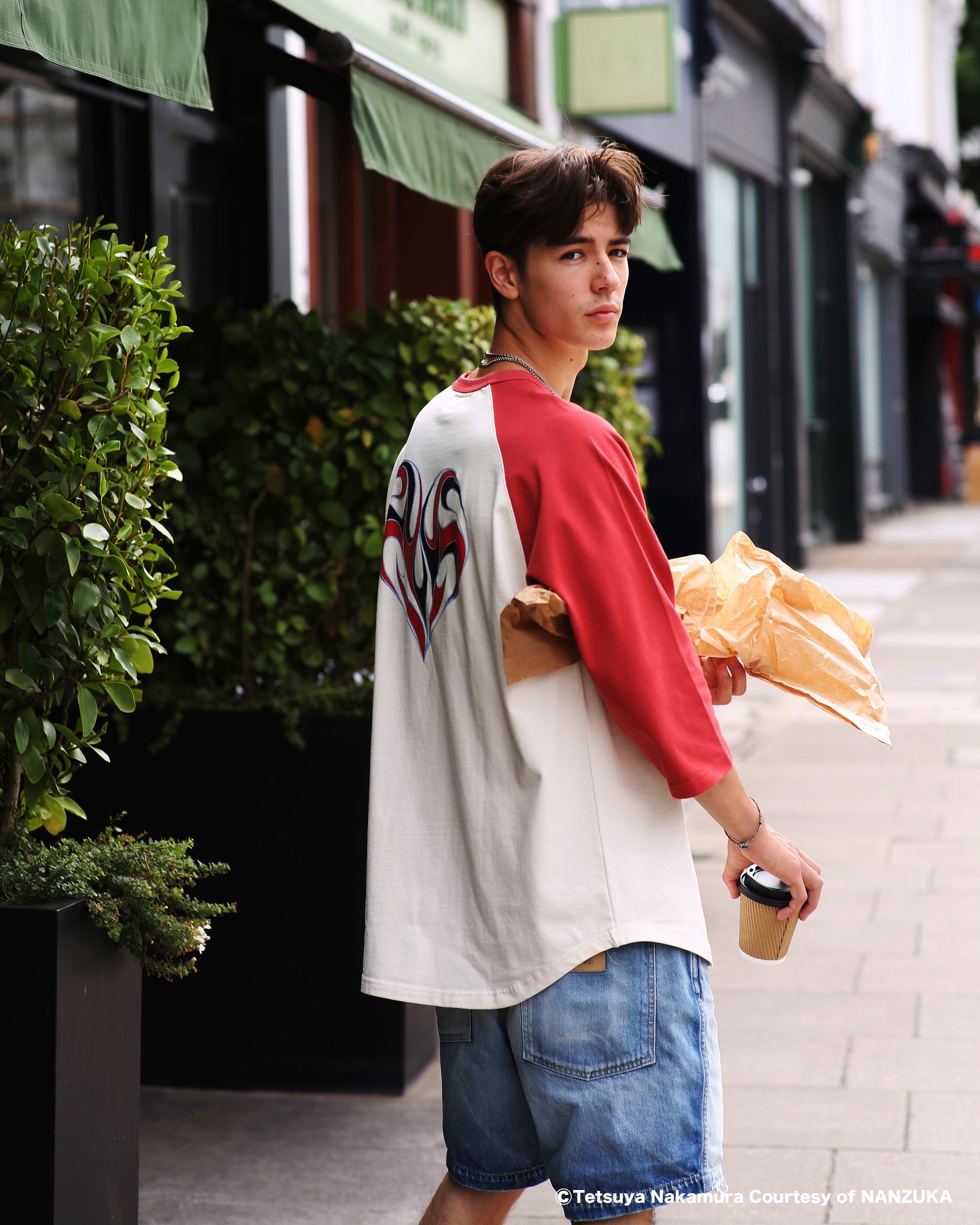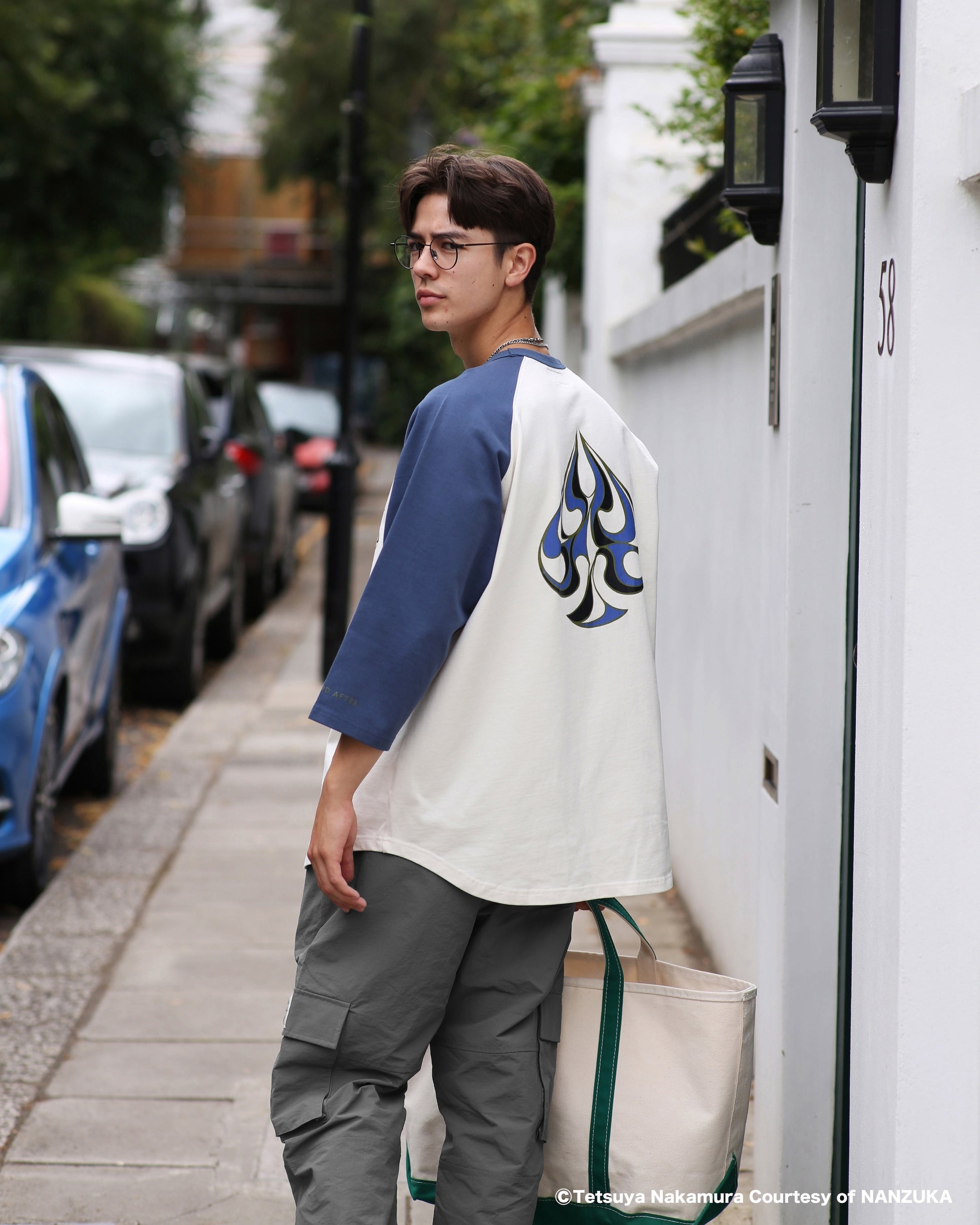9.1oz.の厚みのあるコットン天竺素材を使用したオリジナルボディのラグランスリーブTシャツ。左胸・背面にトランプの柄からインスパイアされたモチーフをクラックプリントで表現したデザイン。袖丈は7分丈、襟・袖を身頃と配色を切り替え、裾はラウンドカット仕様。レギュラーフィットシルエット。2色S〜XLサイズ展開。¥16,500(Tax.in)