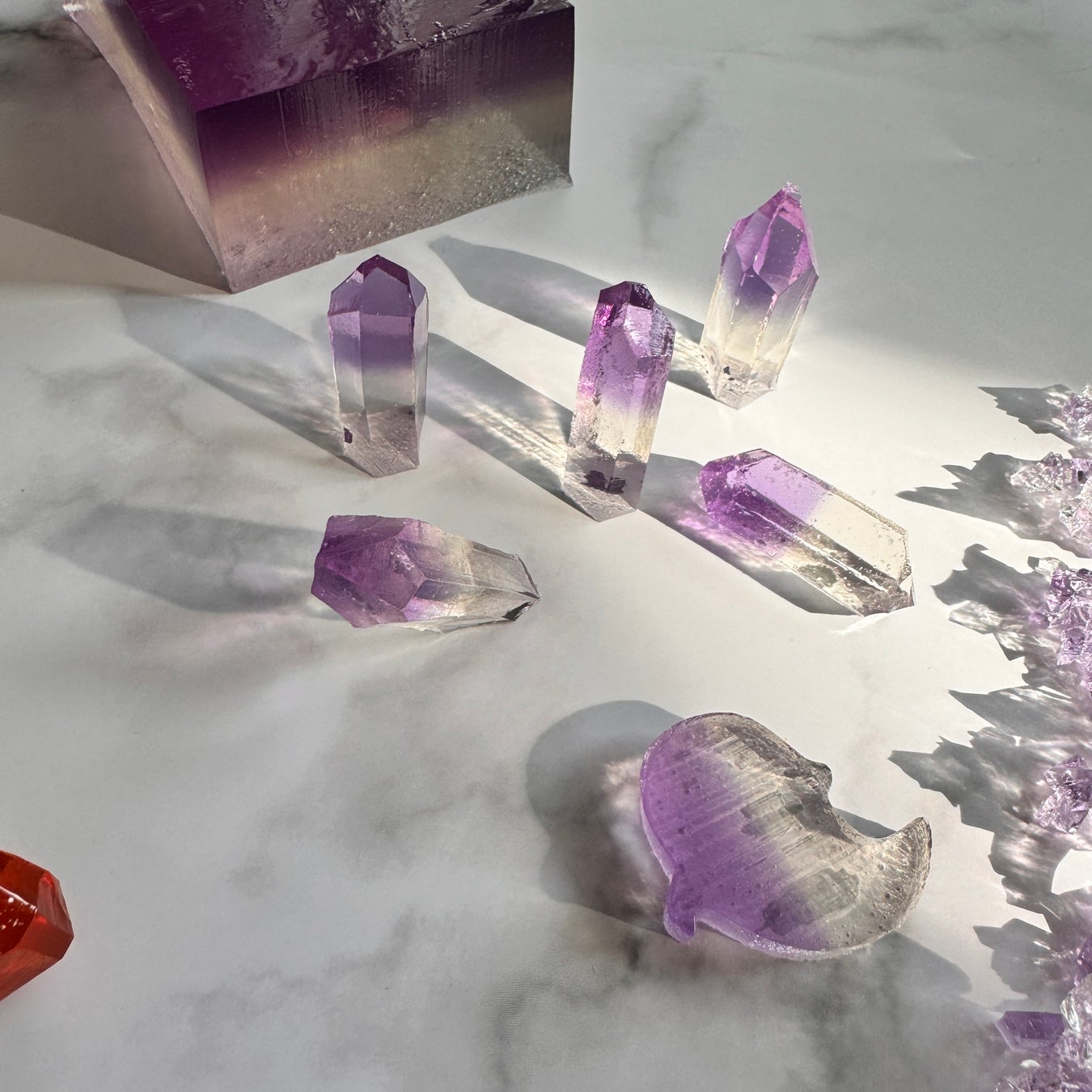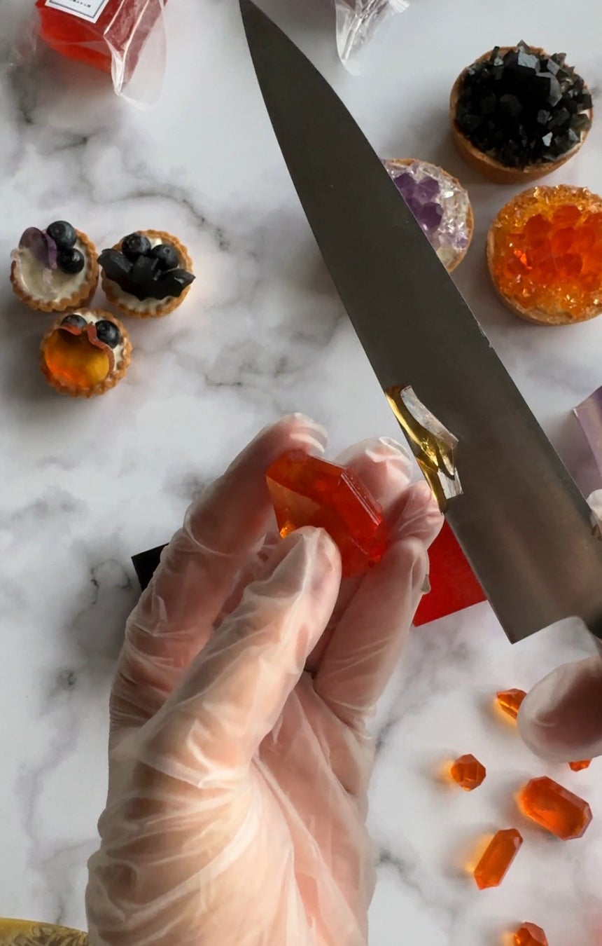 切り立ては透明度が高く、弾力のある寒天や羊羹のような食感。数日乾燥させると表面が結晶化して膜が張り、琥珀糖ならではの食感になります。