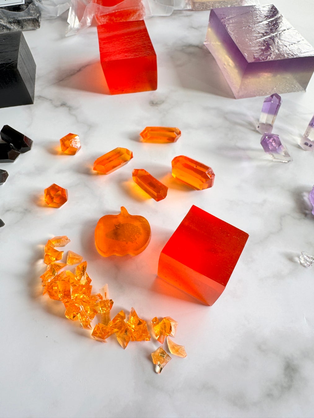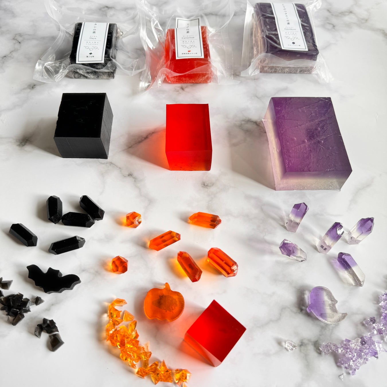 真空パックになった琥珀糖の基本の素をハロウィンカラーで3色セットに。カットするだけで宝石や鉱物みたいな琥珀糖の出来上がり。作って楽しむキットの登場です。