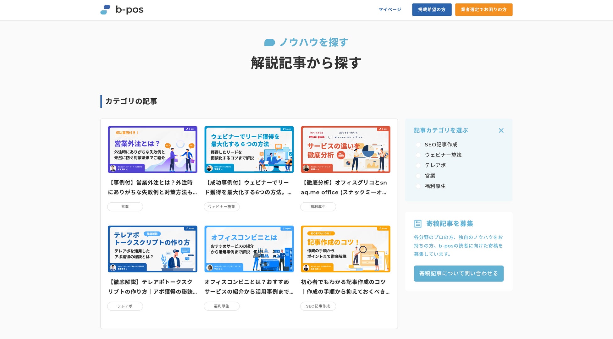 営業・テレアポやSEO記事作成など、各領域の内製化のためのノウハウ、成果を向上させるためのノウハウを探すことができます。各領域のプロフェッショナルが監修し、監修者独自のノウハウが詰まったコンテンツとなっているため、b-pos内でしか得ることのできないナレッジを見つけることができます。