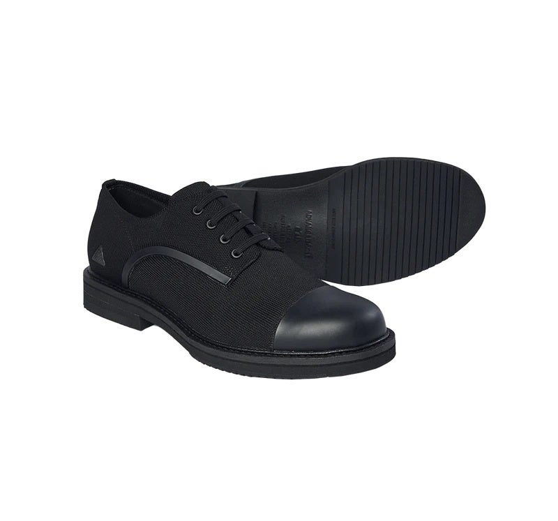 ミリタリーのサービスシューズをベースにデザイン。トゥに丸みとボリュームを持たせたラスト(木型)を採用した、カジュアルとフォーマルのバランスの良さが魅力の一足です。アウトソールデザインは、ミッドソールにEVAフォームシートを追加することで厚みを持たせ、クッション性を向上。つま先のトゥキャップやアイレット、各接合部分に共通の樹脂パーツを使用し、撥水性を高めながらモダンな印象にまとめています。