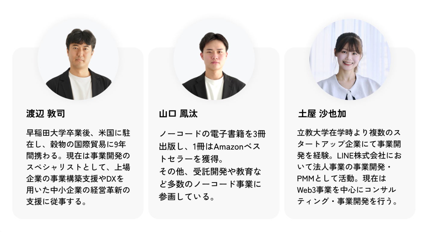 発展めまぐるしいAIやノーコードといった新しいテクノロジーと事業開発、補助金、マーケティングなどのビジネスのノウハウを掛け合わせることで皆様の事業の成功にコミットいたします。