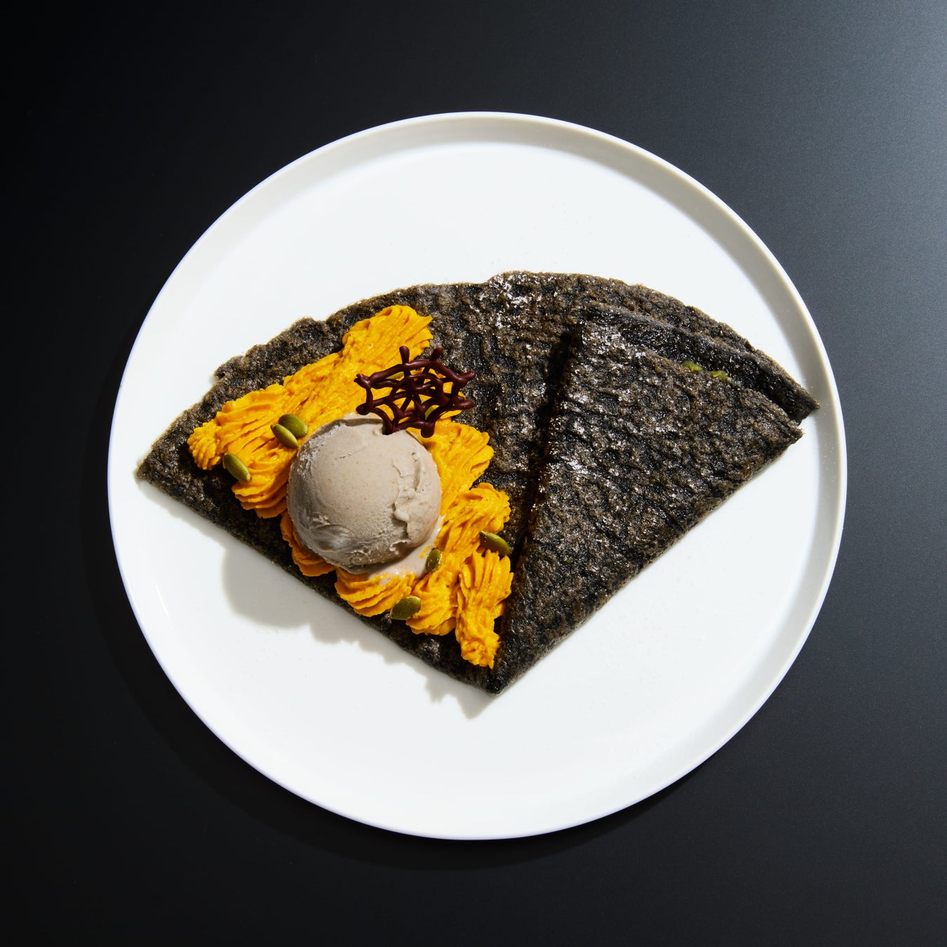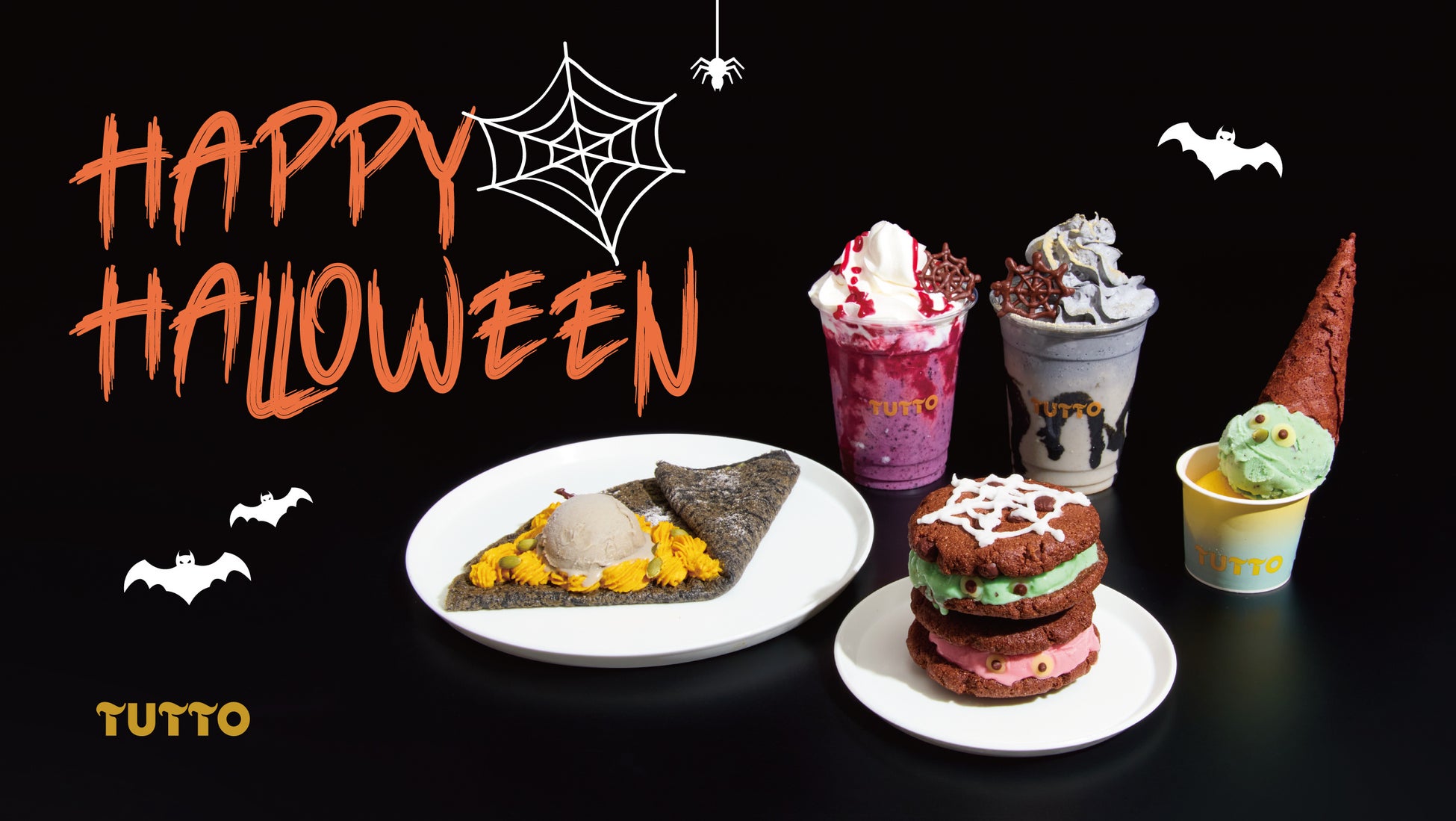 10月限定のハロウィンverクレープはパンプキンクリーム。クレープの中に蜜芋ペーストが隠れていて、優しい甘みが広がります。グルテンフリーのクレープ生地はハロウィンらしいブラックに仕上げました。お好きなジェラートをトッピングして、TUTTOのクレープハロウィンを楽しんでください!