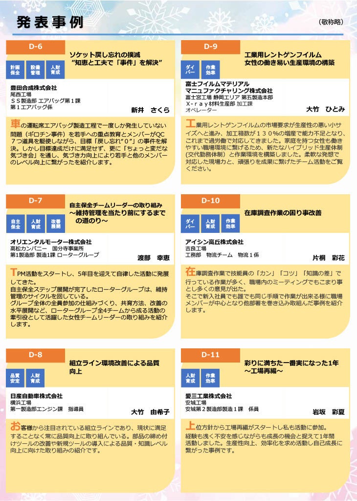 女性が活躍した、輝くモノづくりの現場改善の発表事例概要
