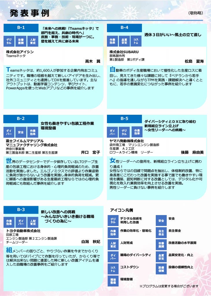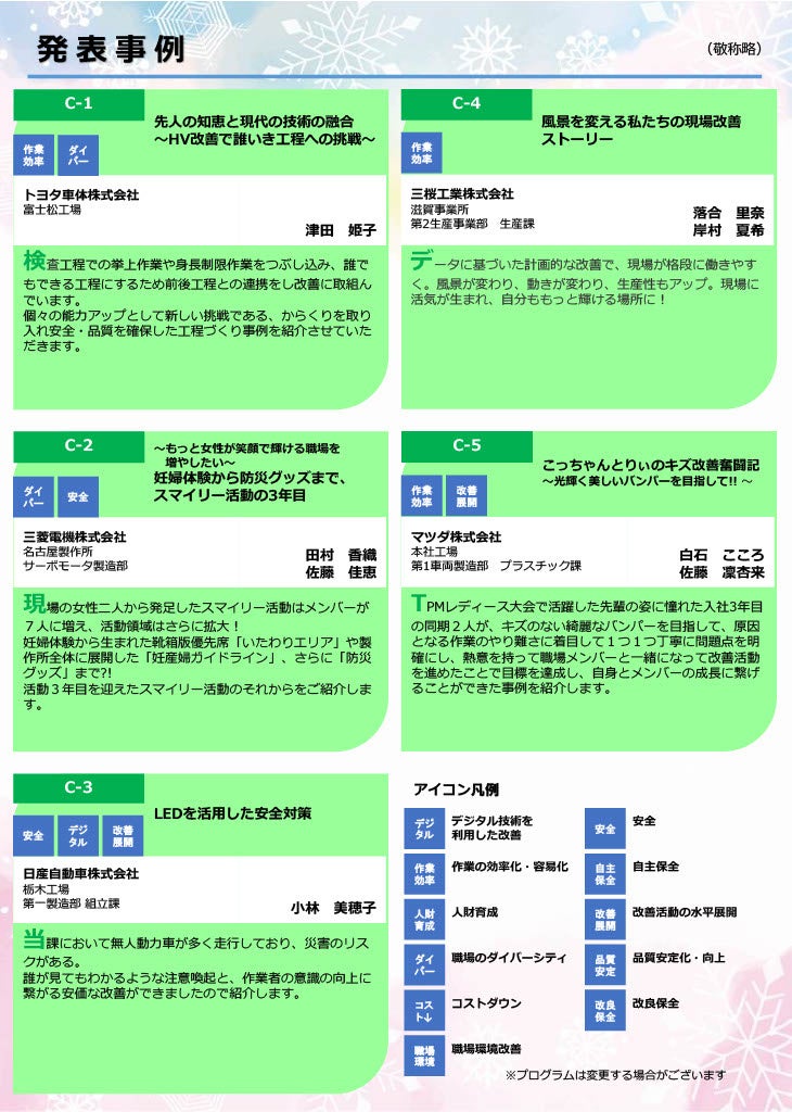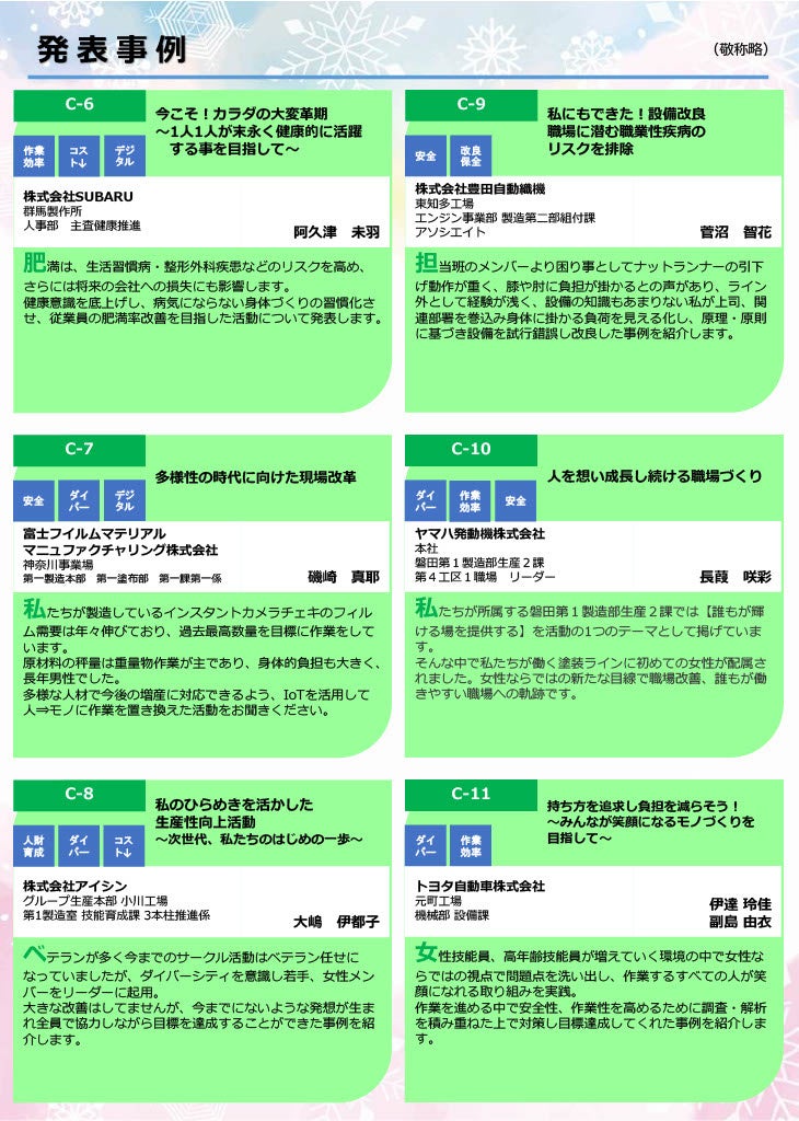 発表の聴講だけでなく、先進企業との交流によって、モノづくり現場のダイバーシティ化の推進の一助として活用いただければと思います。