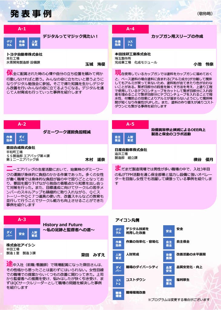 今大会では、事務・間接部門はもちろんのこと、一般的には女性比率が高くない製造現場の改善事例など、20社の先進企業による全44事例の発表が一挙に集結します。