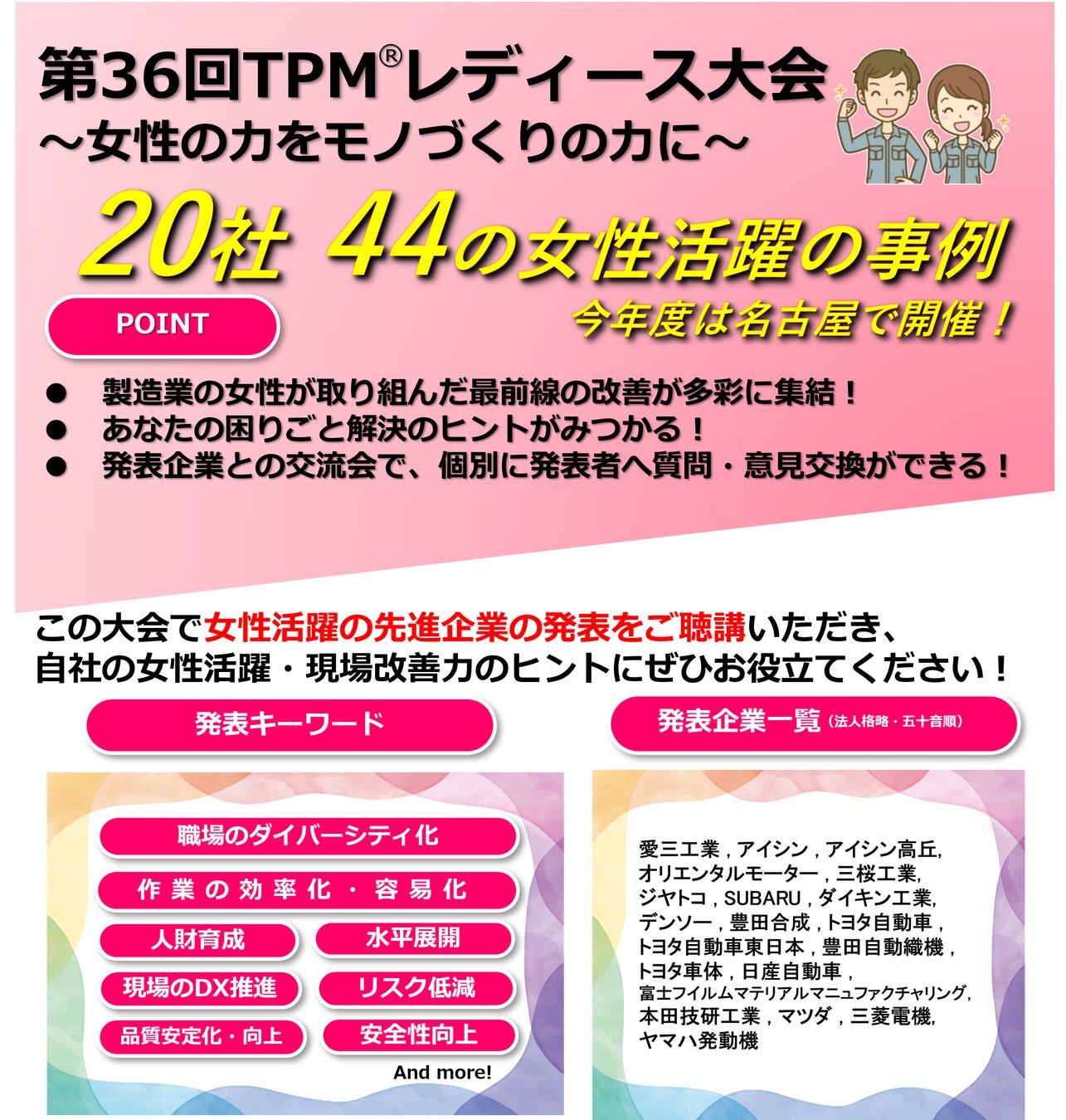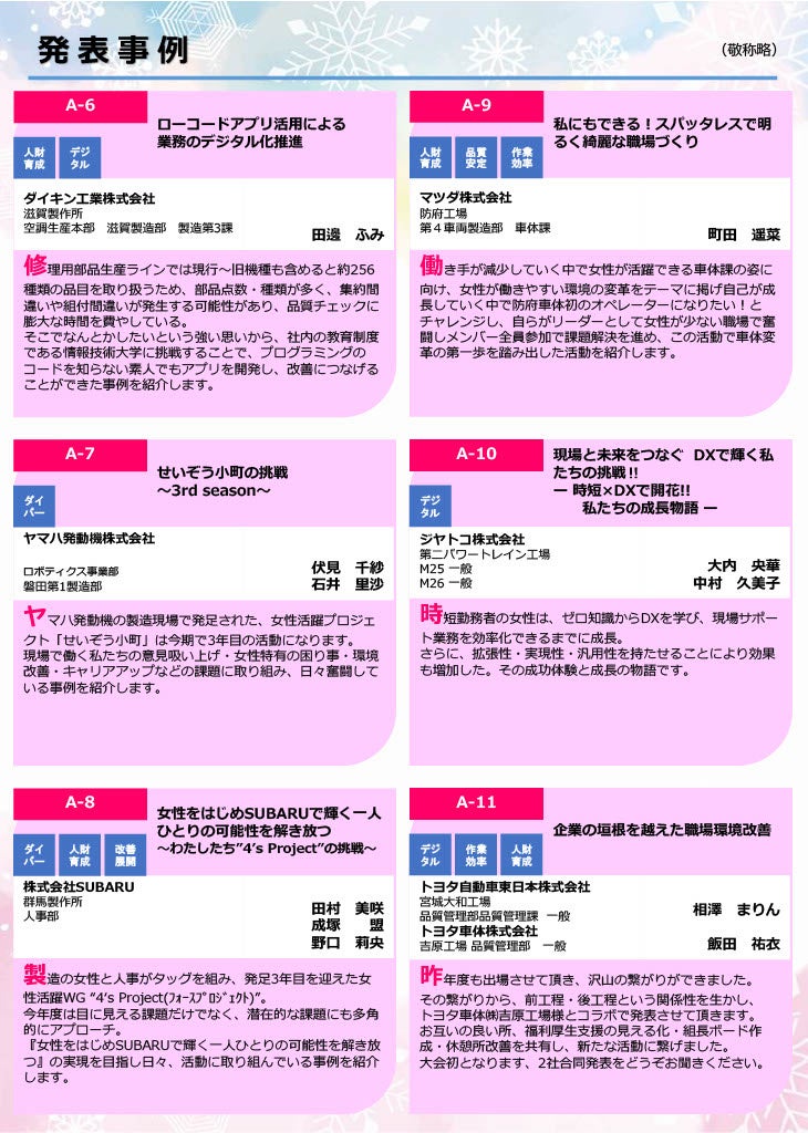 ぜひこの機会に会場で女性活躍の先進企業の発表をご聴講いただき、自社の女性活躍・現場改善力のヒントにぜひお役立てください!