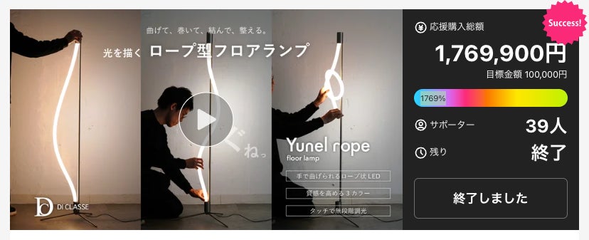 照明メーカーの株式会社ディクラッセ(本社:東京都台東区、代表取締役:遠藤道明)は、応援購入サービス「Makuake」にて先行販売を実施した新製品、ロープ状LEDフロアランプ『Yunel rope(ユネルロープ)フロアランプ』が、開始わずか5時間で目標金額(売上100万円)を達成し、最終的に目標比1769%(応援購入総額 1,769,900円)という圧倒的な支持を得たことをお知らせいたします。