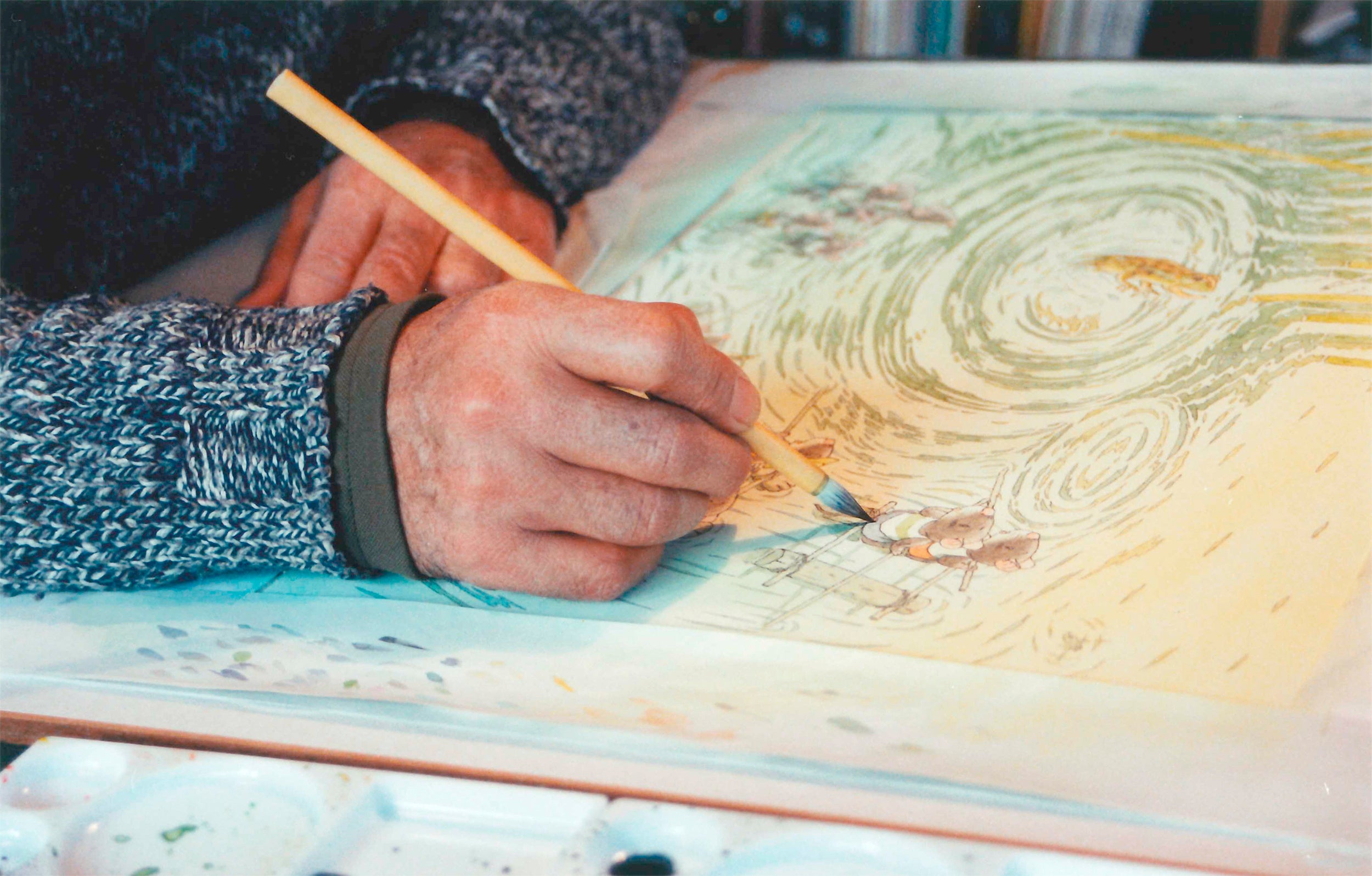 14ひきの視点になり、たんぽぽを見上げて描いた『14ひきのぴくにっく』、昼から夜の変化を何日も観察したという『14ひきのおつきみ』など、自然と向き合い多くの作品が生まれました。