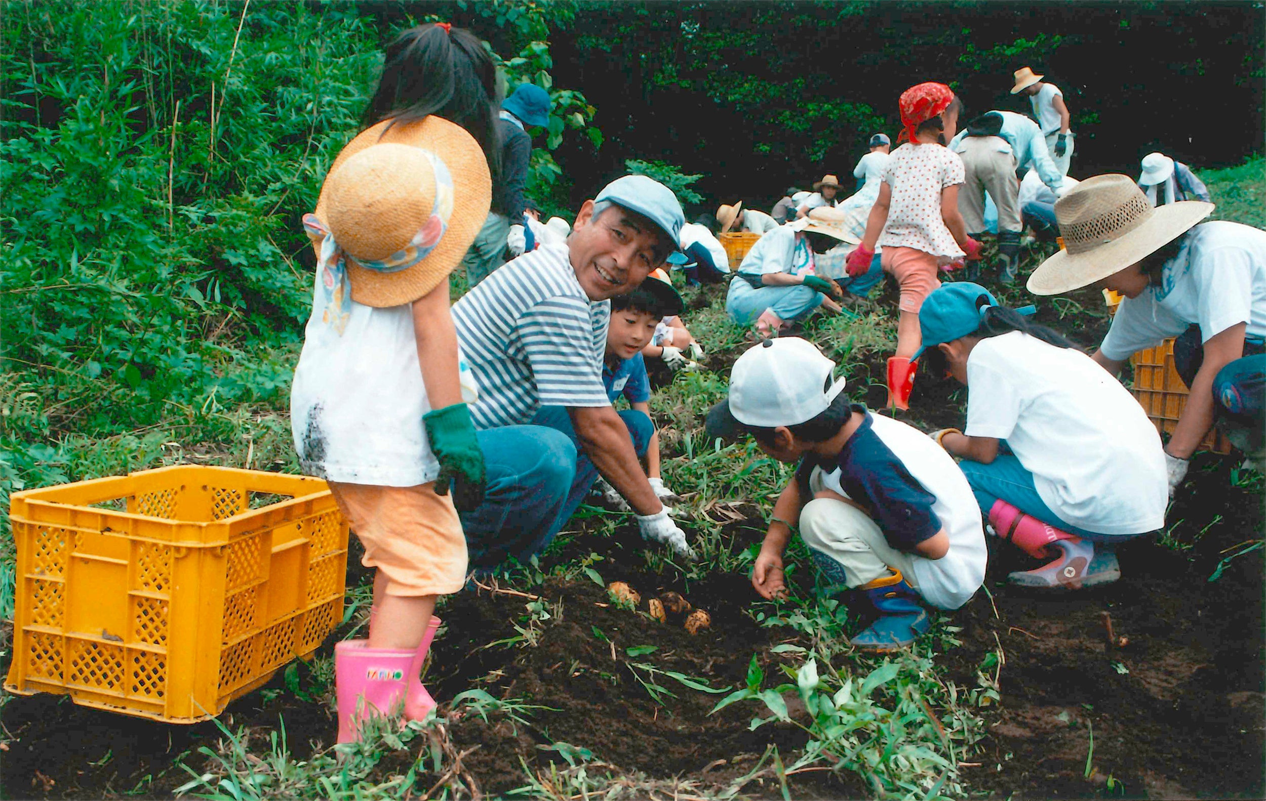 2度目の引っ越し先の益子にて、雑木林で家族と過ごすいわむらかずおさん (いわむらかずお絵本の丘美術館 提供)