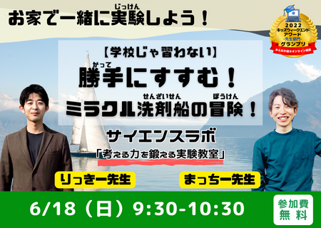 “考える力を鍛える実験教室” サイエンスラボは、まっちー先生とりっきー先生による二人組ユニットです。お二人の実験教室では正解を出すことではなく、子どもが自分の力で試行錯誤することを目的としています。実験の成功に主眼を置かず、また、材料の量や混ぜ方や使い方などは参加者自身に考えてもらうために、あえて必要以上に詳細を伝えないようにしています。今回のテーマは「洗剤のパワー」。掃除で使う洗剤を使い、自分で作った船と洗剤を用い、科学の不思議に触れる実験にチャレンジします。