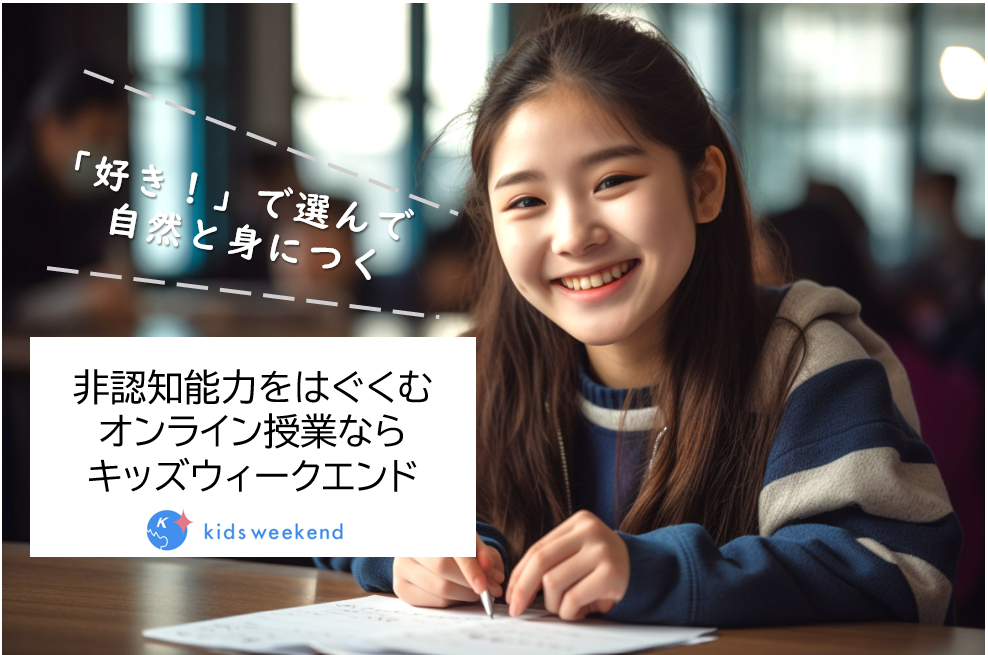 学校や塾などの教育現場だけでなく、各家庭でも子どもの非認知能力をはぐくむ工夫が大切ですが、保護者も多忙ななか現実的には難しい面もあります。そこで、探究型オンライン教育プラットフォームのキッズウィークエンドでは、非認知能力の育成が期待できる授業を豊富にラインナップしており、ご家庭で楽しみながら授業を受けることでお子さまの好奇心の芽を育てていくことができます。授業はアートや科学、デジタルなどの幅広い分野にわたり、授業は視聴するだけでなく参加型でライブな体験ができるため、自分で考え意見を導くなどの実践力も期待できるものです。さらに、開講授業はそれぞれに代表的な非認知能力の育成が期待できるプログラムとなっているため、難しく考えずお子さまの好奇心や好きだと感じる授業をお選びいただくことで自然と力を磨いていくことができます。