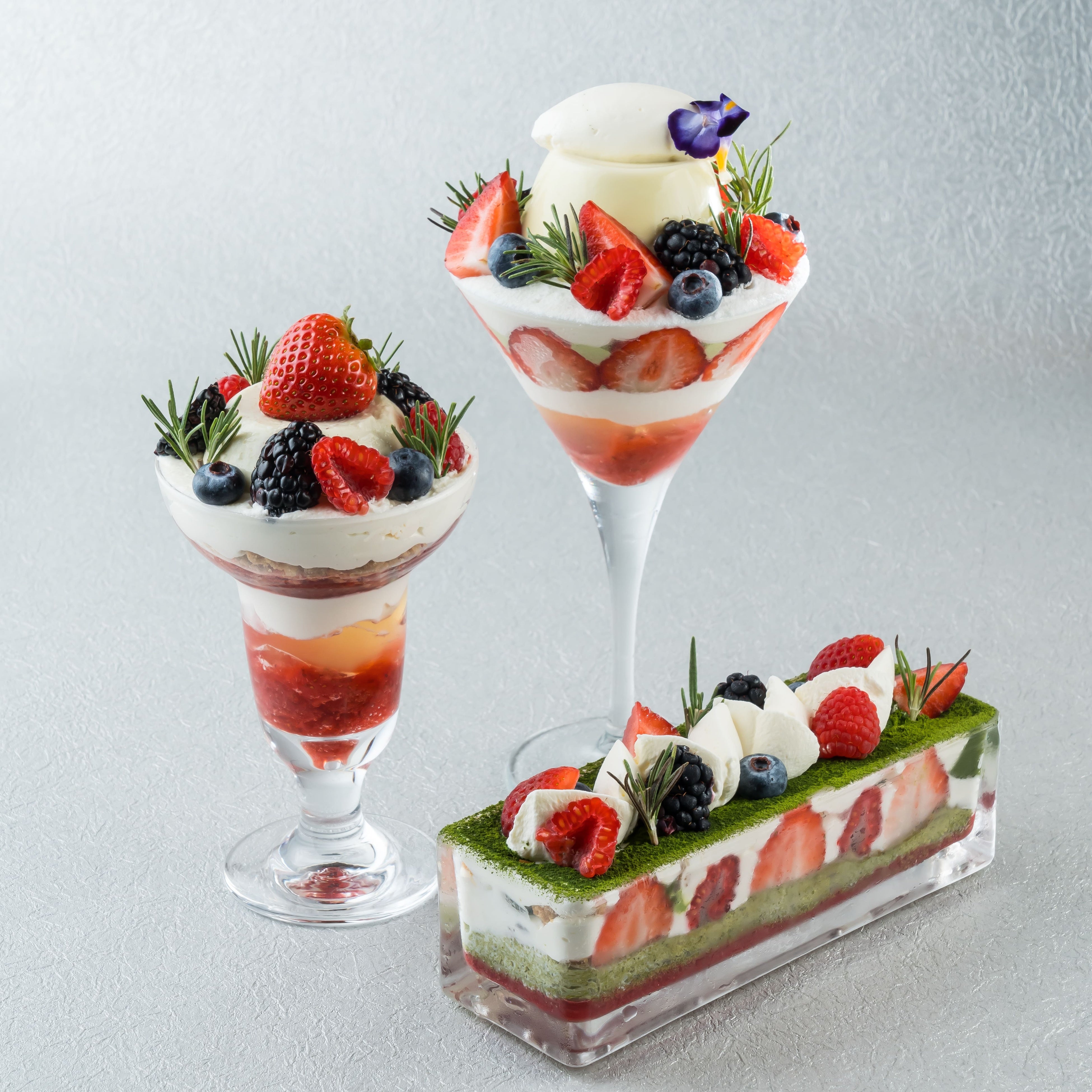 【構成】ブルーベリー/フランボワーズ/ブラックベリー/ローズマリー/苺/ピスタチオパンナコッタ/粉糖/生クリーム/クランブル/抹茶アイス/苺のコンポート/りんごとバラのジュレ *林屋茶園のパフェにはそのほかキルシュ入りマスカルポーネクリームやクレームダンジュを使用。