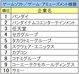 ◆ゲームソフト/ゲーム・アミューズメント機器業界TOP10◆